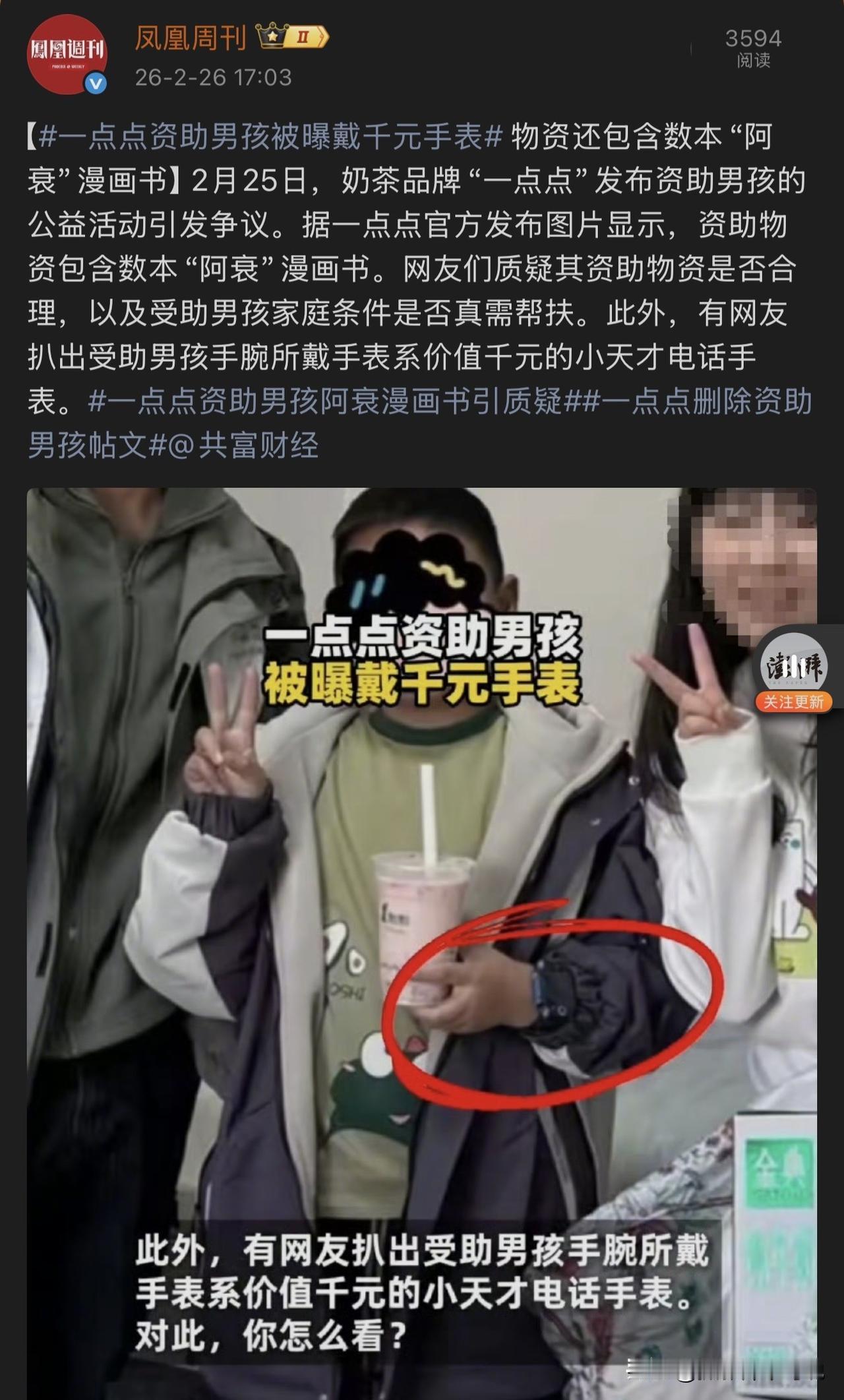 一点点奶茶发起资助的男孩被曝戴千元小天才手表,网友们瞬间不干了。最近网友在一点点的官方发布的资助照片中发现了一受资助的男孩居然戴有上千元价格的小天才手表,而且还资助有漫画书。所以网友觉得这个资助可能存在合理性问题,会不会把爱心款项用到了不该用的地方?关于此事,我觉得可以让子弹飞一会儿,因为新小天才手表虽然价值可能上千元,但未必就是自己购买的新手表。可能是老款式、可能是二手、也可能是别人送的等等。现在一点点遭受到公众质疑,必定会对这件事儿进行彻底调查的。咱们吃瓜群众就谨慎吃瓜,等最终官方调查结果吧!