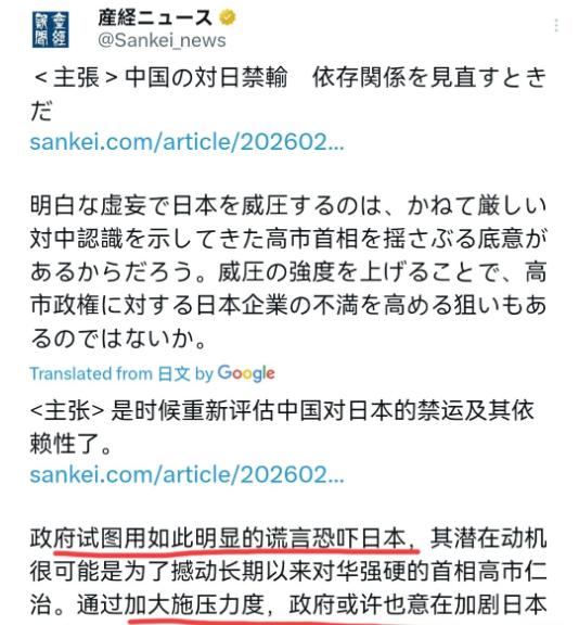 日媒表示,面对中国的一再“恐吓”,日本政府不应该只是进行外交驳斥,而是应该积极行动,达成国际共识,反制中国! 当地时间2月26日,日本《产经新闻》爆出的一则报道,看得人满是无奈。日媒在报道里公然宣称,中国在一再“恐吓”日本。 日媒明确表态,日本政府不该只靠外交驳斥应对中国。日媒建议日本政府拿出实际行动,联合其他国家达成国际共识,以此反制中国。 日媒着重强调,中国正在进一步加大对日本的经济压力。这一说法,成为他们炒作中国“恐吓”的核心依据。 今年1月份,中国政府已经正式宣布,收紧对日本的两用物项出口管制。这是中方基于自身安全和国际义务采取的合法举措。 紧接着,中国政府更进一步,直接点名批评并管控了具体的日本企业。商务部2月24日发布公告,将40家日本实体列入管控或关注名单。 日媒对此反应激烈,直言中国的这种行为令人无法接受。他们甚至将中方的合法管控,说成是明显的“谎言”,宣称中国在以此恐吓日本。 日媒还胡乱揣测,中国这么做背后肯定另有图谋。他们声称,中方的核心目的是动摇日本首相高市早苗的位置。 高市早苗长期坚持对华强硬立场,日媒认为中国想通过加大所谓“恐吓”力度,加剧日本企业对高市政府的不满。 日媒还刻意渲染风险,称所有在华经营的日本企业,都面临着共同的“巨大风险”。这种说法完全是夸大其词。 日媒趁机煽风,建议日本企业加快考虑降低对中国的过度依赖,避免每次中日关系恶化时遭受重创。 大家先理清事实,中方的所有举措都有法可依。中国商务部明确表示,这些措施是为了制止日本“再军事化”和拥核企图。 此次被列入管控名单的20家日本实体,大多参与提升日本军事实力,生产舰船、战斗机等进攻性装备。 另外20家被列入关注名单的实体,是因为无法核实两用物项的最终用户和用途,中方只是实施更严格的审查。 中国外交部发言人毛宁也明确表态,中方举措完全正当、合理、合法,不影响中日正常经贸往来。 高市早苗政府近期动作频频,不仅发表涉台错误言论,还推进修订安保文件、扩充防卫预算,加速日本“再军事化”。 中方的管控,本质上是对日本危险动向的制衡,是维护地区和平稳定的必要行动,根本不是什么“恐吓”。 日媒刻意炒作“中国恐吓论”,无非是想混淆视听,转移国内民众对日本经济困境的注意力。 当前日本经济结构性弊端凸显,日元购买力创53年新低,GDP降幅扩大,这些都和中方举措没有关联。 日媒怂恿日本企业脱华,更是不顾日本企业的实际利益。中国是日本重要贸易伙伴,脱离中国市场只会让日本企业雪上加霜。 说到底,日媒的一番炒作,全是出于自身政治目的。他们试图绑架日本政府和企业,破坏中日经贸合作,实在令人不齿。