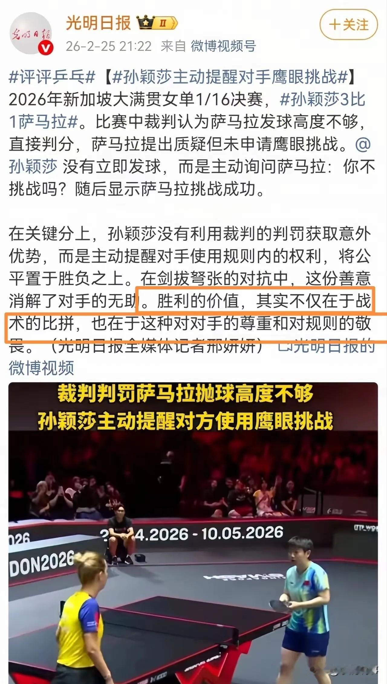 谁看了孙颖莎不竖大拇指! 这姑娘真的让人佩服了。 赛场上赢球不算本事, 赢心、赢尊重,才是真的厉害。 这次比赛她又一次用行动圈粉无数,不执着于一分一毫的得失,把公平和尊重放在最前面,认真对待每一场比赛,也真心尊重每一位对手。这样的气度和修养,不光得到官方点名表扬,就连对手都发自内心佩服,国外选手也纷纷点赞认可。 很多人都说,喜欢孙颖莎,不只是因为她球打得好,更是因为她人品端正、格局大气。低调努力、不骄不躁,有实力却不张扬,有成绩却依旧谦逊。 真正的强者,从不是只赢比分,而是赢下所有人的尊重。 球技是底气,人品是光环,格局才是最打动人的地方。 这样努力又通透的姑娘,难怪越来越多人打心底里喜欢。