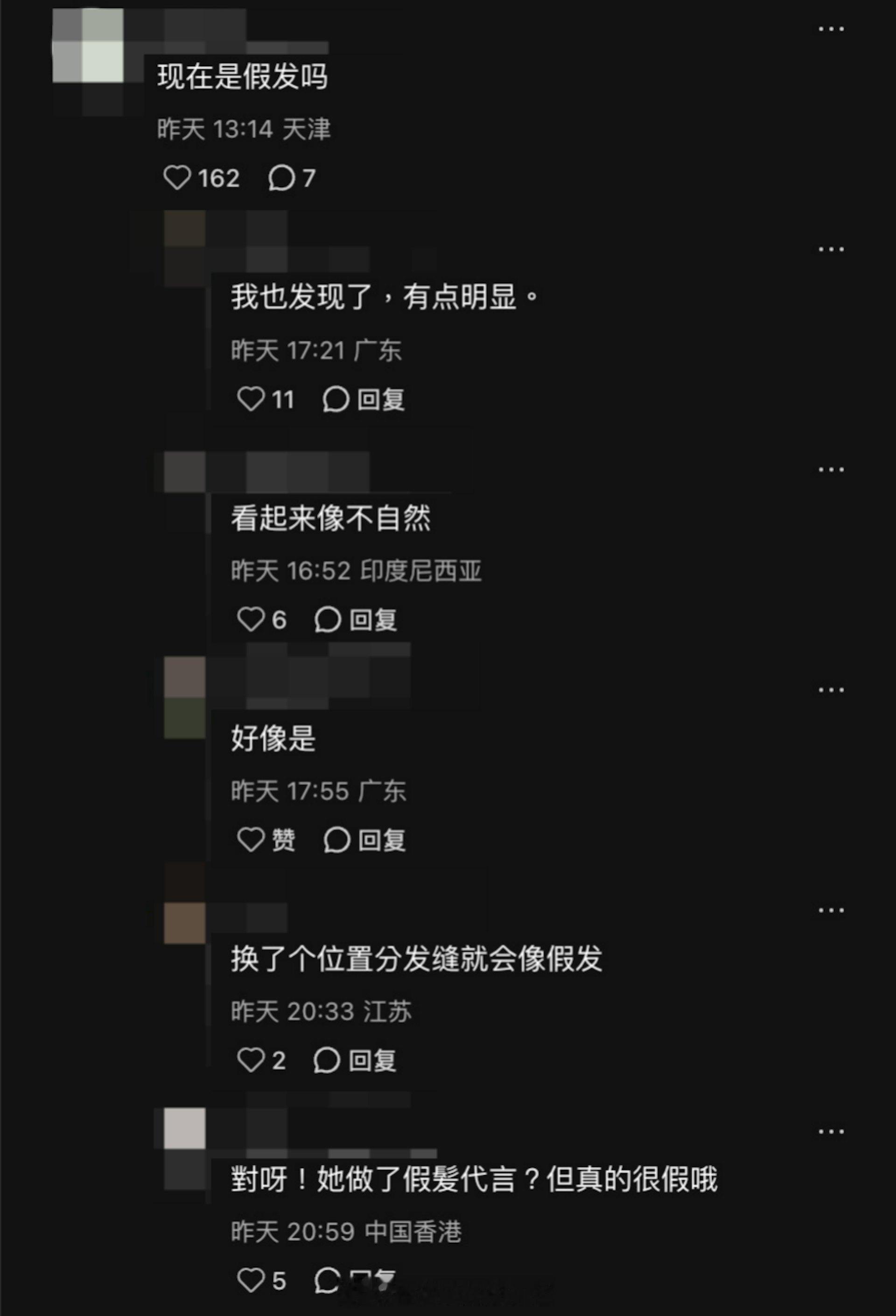 不少网民也表示看不习惯:“看起来很不自然”、“对呀!她做了假发代言?但真的很假哦”、“假发太明显了吧”、“是假刘海”、“不要戴假发和刘海,超明显,美女不需要这些!”,更有网民直指这个造型拉低了她的颜值:“糊涂啊,刘海遮住了你的美!”、“这个假发真是很难看”、“样子没变过,但是这个假发影响了你的颜值”、“姐,刘海封印了你的颜值”;不过,也有网民猜测可能只是分界位置改变而产生错觉:“换了一个位置分发缝就会像假发”,看来大家对陈茵媺“刘海造型”评价还是一般。