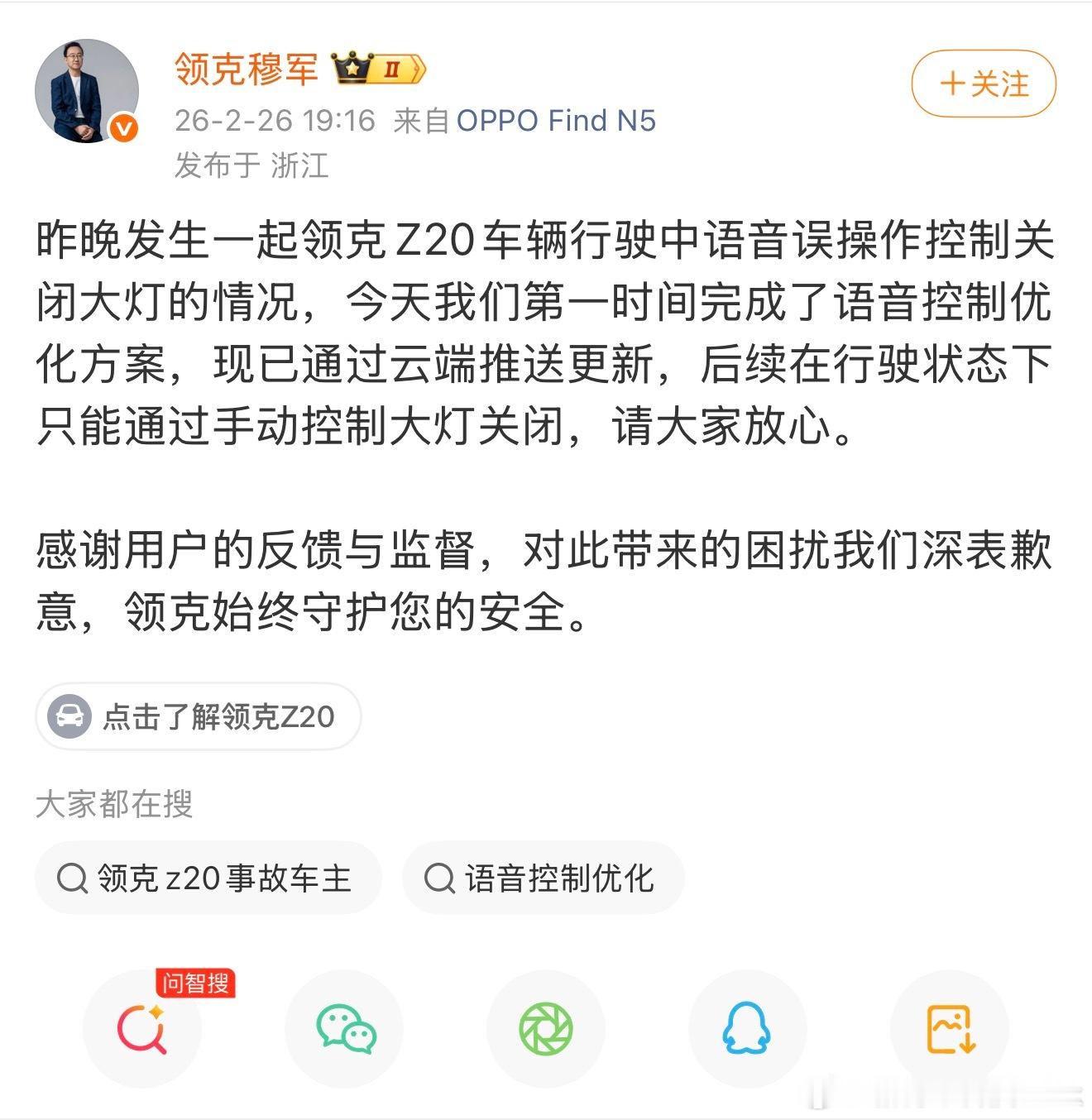 领克高管承认了领克Z20车辆行驶中语音误操作控制关闭大灯的情况,并且已经开始推送优化更新,后续在行驶状态下只能通过手动控制大灯关闭