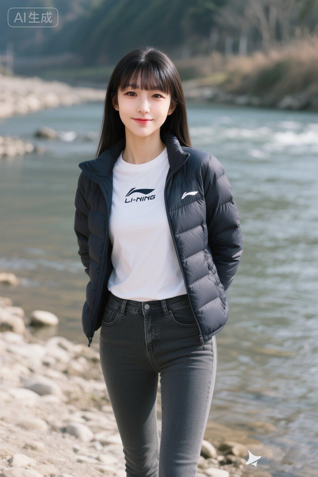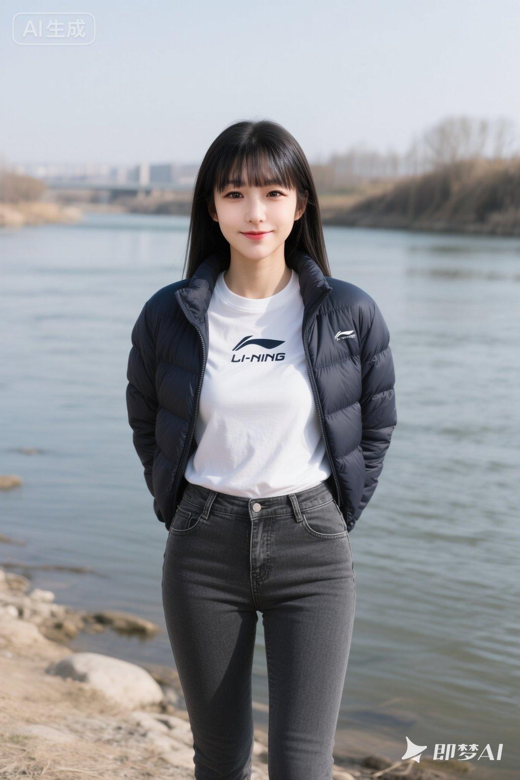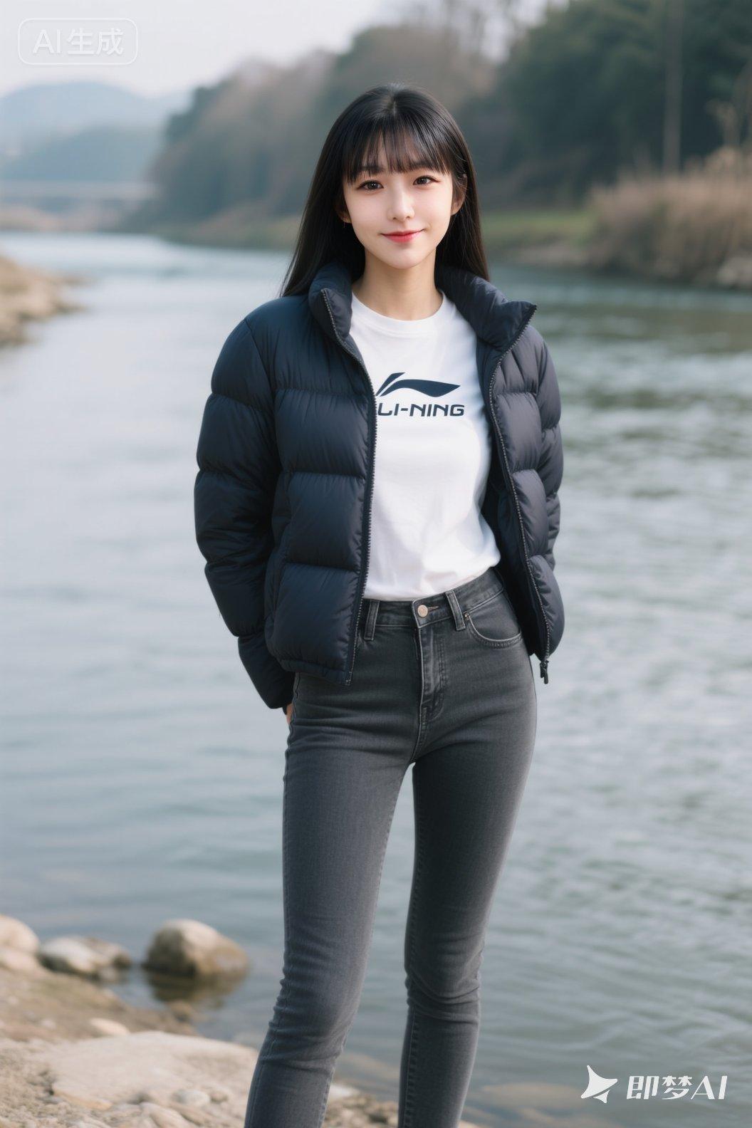 女孩河边上伫立,前庭饱满挺拔,梨涡浅笑,深色时尚的羽绒服,超贴身紧身深灰色牛仔裤,内搭白色T恤