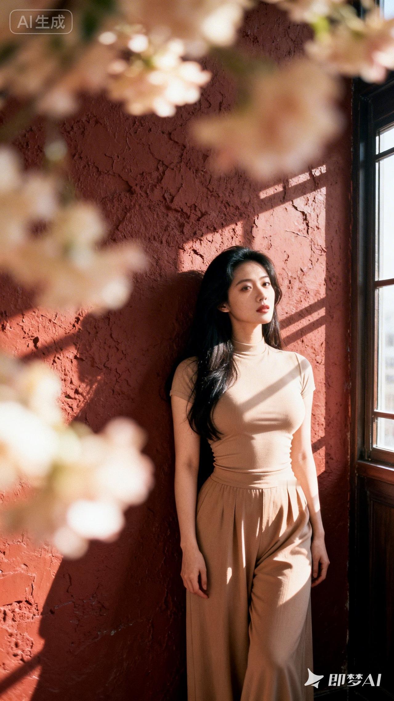 在盛开的桃花园里,姐姐穿着淡黄色衬衣,下身穿米白色裤子,齐肩短发