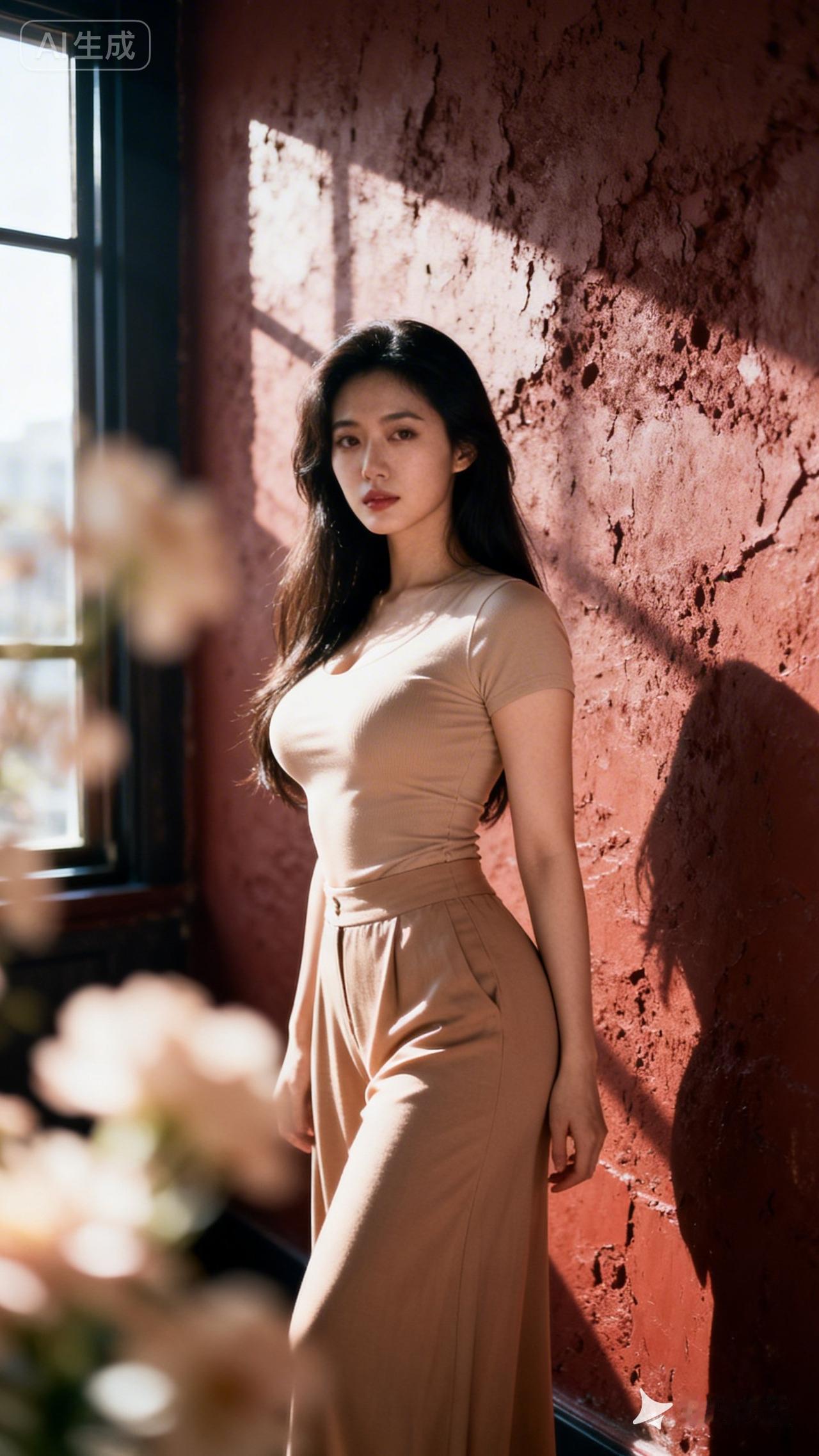 18岁女大学生,尖下巴,三庭五眼比例均衡,棕色简约盘发。身材娇小,细腻陶瓷水嫩肌