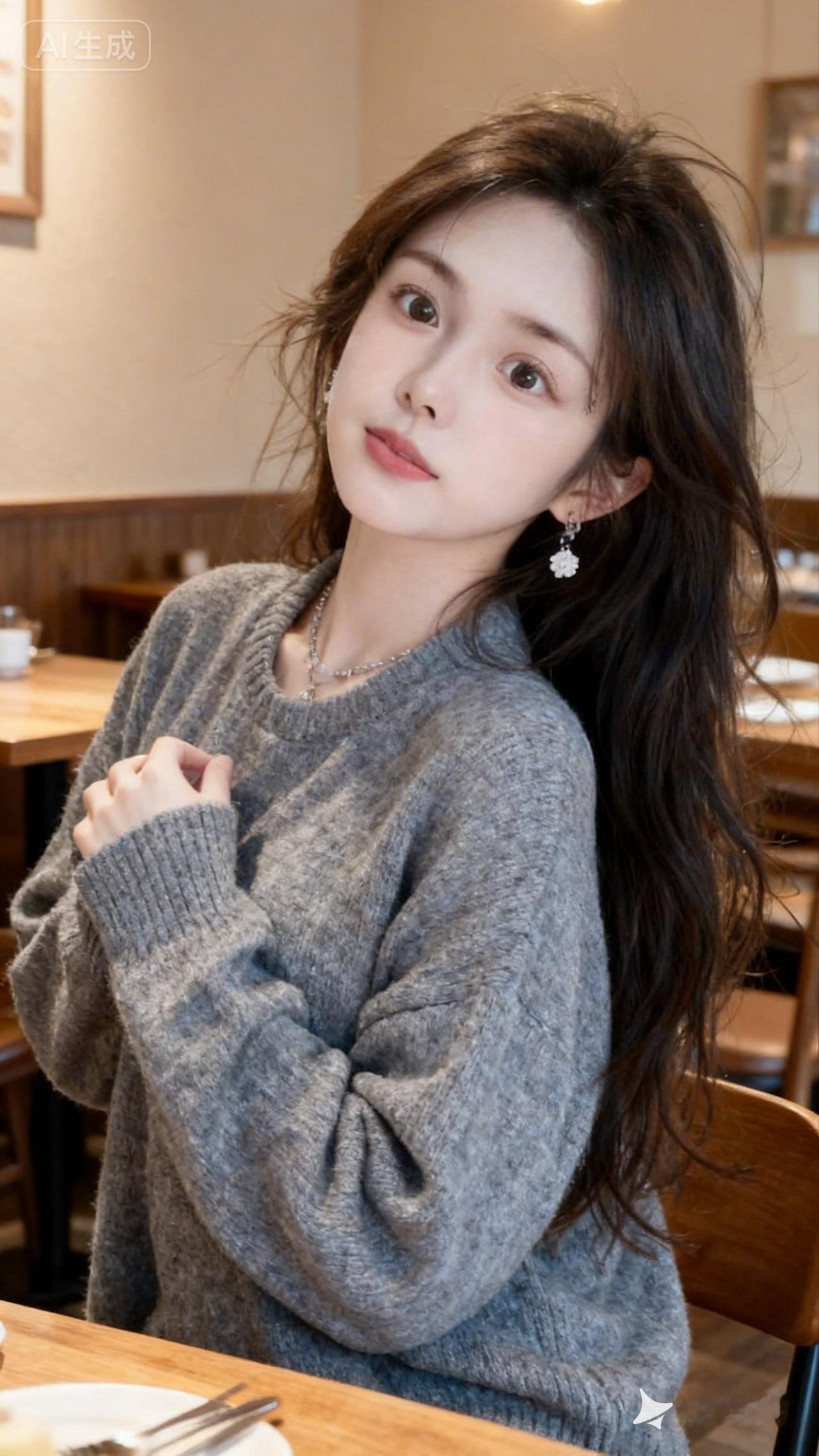 中国绝色美女,苹果型可爱身材,上半身圆润有生活气息,穿白色毛衣搭配格子深V领裙子