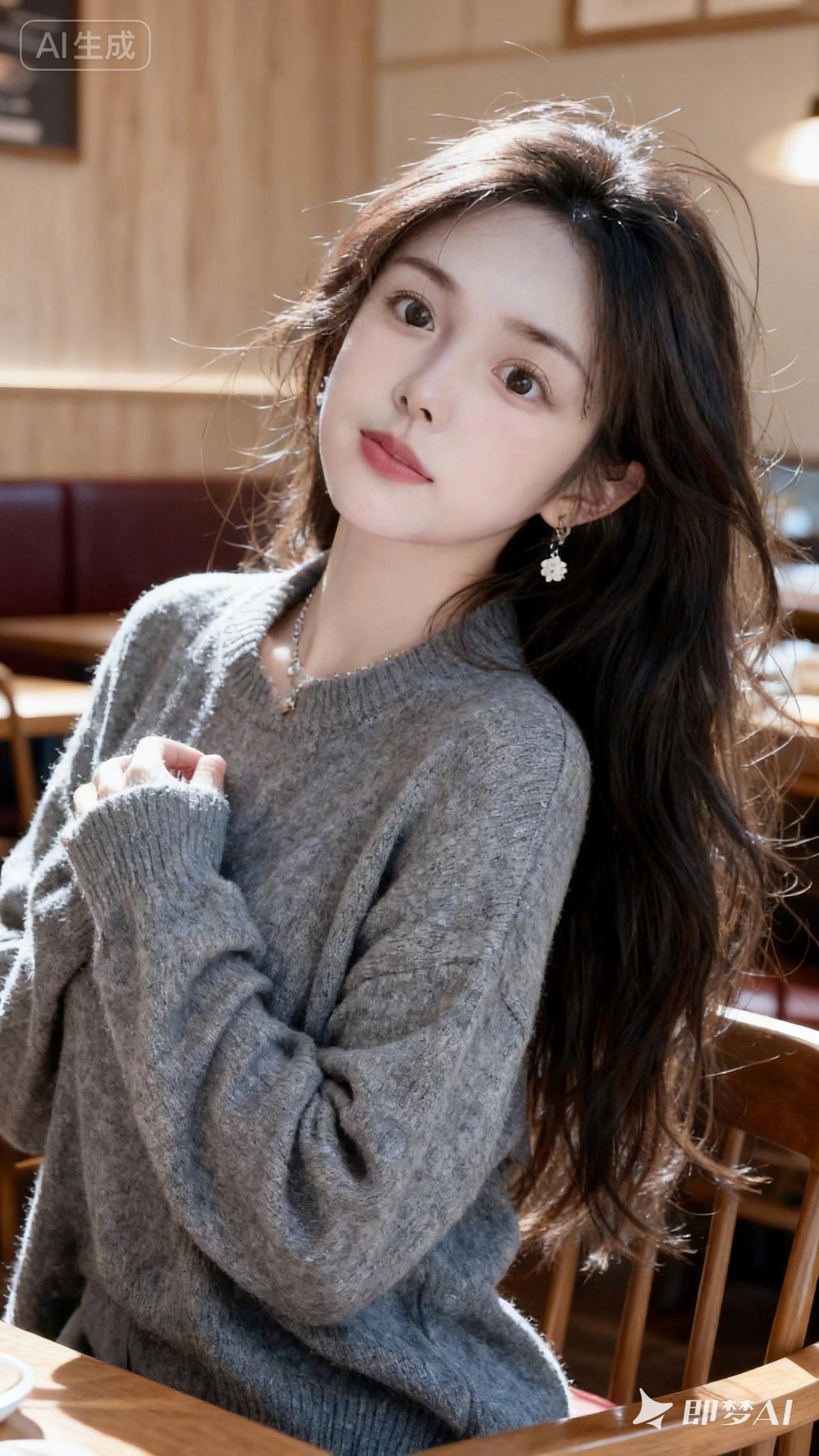 优雅,微笑,发丝柔顺有光泽,黑棕色长直发,浓眉大眼睛明亮有神,皮肤白皙,长耳坠,
