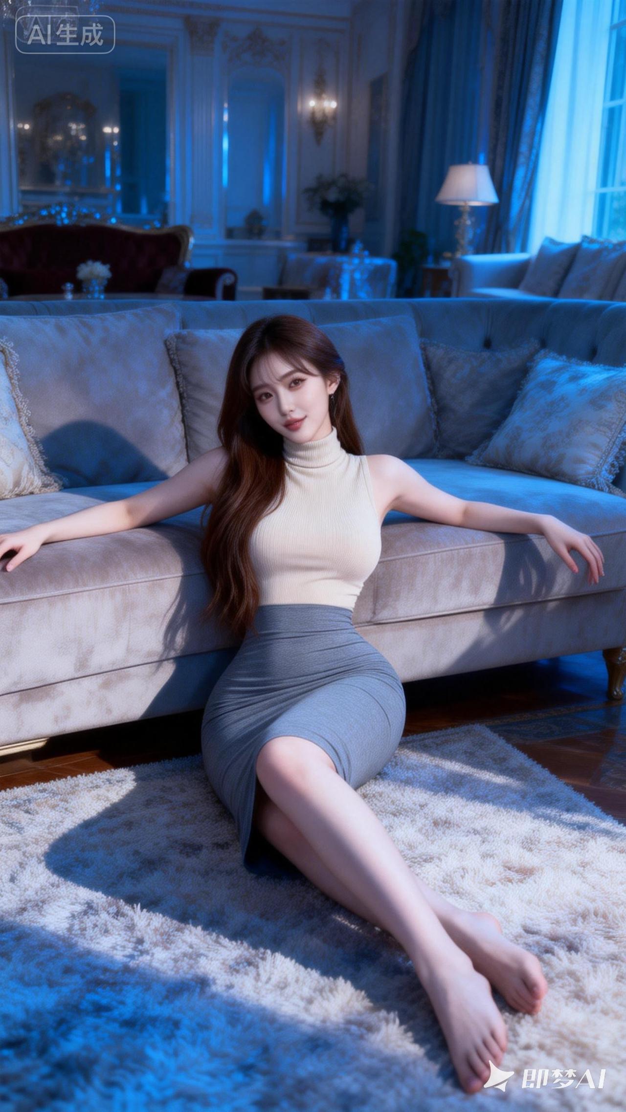 19岁冷白皮网红风女生。葫芦S形身材,九头身,棕发及腰,高鼻梁显瘦脸型,表情灵动慵懒,穿米色高领无袖打底衫,灰色紧身包臀裙