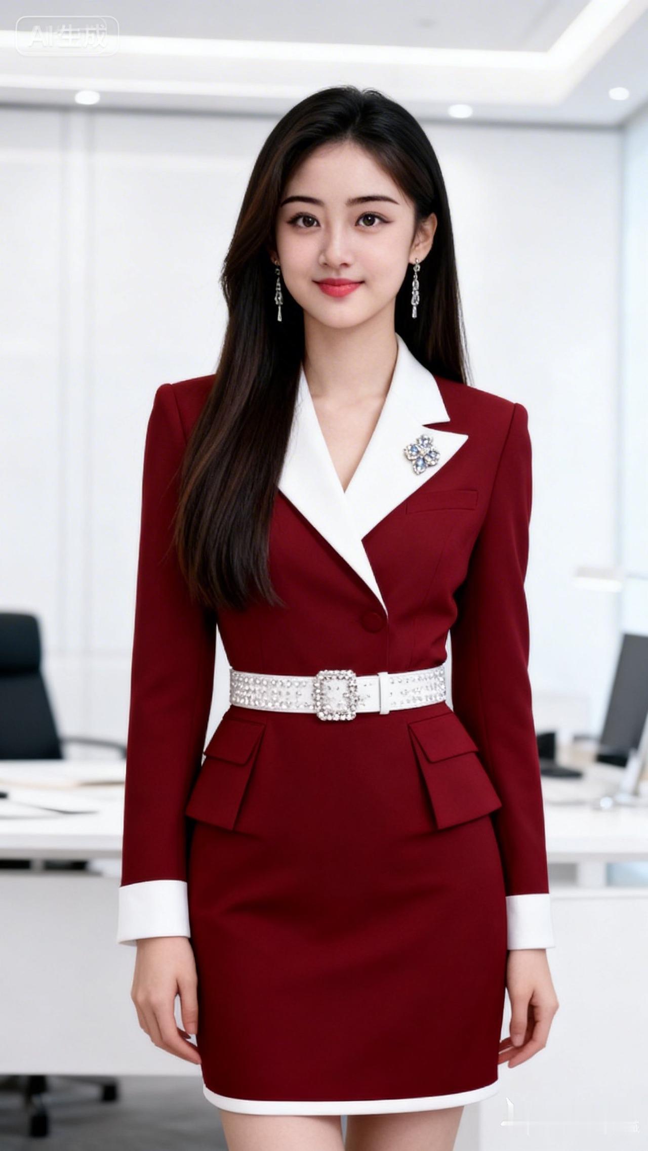 优雅,微笑,发丝柔顺有光泽,黑棕色长直发,浓眉大眼睛明亮有神,皮肤白皙,长耳坠,身穿孔酒红色涤纶掐腰西服套装裙,衣服腰上系白色亮晶晶腰带,西服领子白色的,领子上面亮晶晶胸针,衣服底边白色边,长袖袖口白色