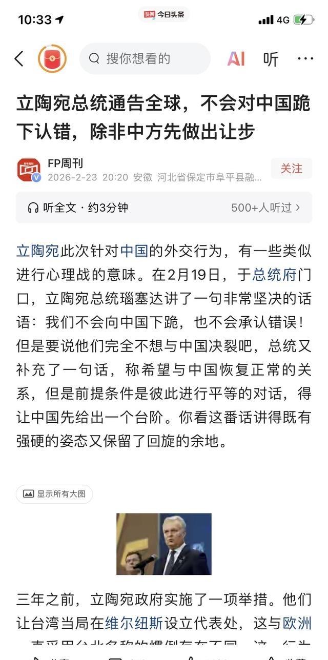 立陶宛总统大肆渲染“绝对不会对中国跪下认错”,令人目瞪口呆!有本事你丫一直站着,我看您能横多久?刚刚看到,在2月19日,于总统府门口,立陶宛总统瑙塞达讲了一句非常坚决的话语:我们不会向中国下跪,也不会承认错误! 一个弹丸小国总统突然放出狠话,声称绝不向大国低头,这背后藏着多少经济纠葛和政治算计?立陶宛与中国关系从友好到冰点,只因一处代表处名称,就引发贸易壁垒和外交降级。这样的强硬姿态,能撑多久?读者往下看,就能明白这事儿的来龙去脉,以及小国在大国博弈中的尴尬处境。 立陶宛与中国关系紧张源于2021年允许台湾开设代表处,使用“台湾”名称而非“台北”。这被视为挑战一个中国原则,中国立即抗议,指责制造“一中一台”印象。立陶宛政府称此举仅为经济合作,不影响外交承诺,但北京不接受这种解释。 2021年8月,中国召回大使,要求立陶宛相应行动,双边关系降到代办级。11月代表处开幕后,中国实施贸易限制,暂停进口立陶宛农产品如小麦和乳制品。出口额从高峰期每月数亿美元降到几乎为零,木材和激光行业首当其冲,企业面临订单取消和库存压力。 中国还对欧盟企业施加影响,警告使用立陶宛零部件可能影响对华业务。德国公司如大陆集团收到通知,导致供应链调整困难。立陶宛转向其他市场,但转型需时间,失业率小幅上升。欧盟支持立陶宛,向世贸组织投诉中国做法。 2022年,立陶宛在台北开设贸易处,进一步加深分歧。台湾提供资金援助,包括投资基金用于科技合作,但实际效果有限,仅有少数项目落地。国内企业抱怨贸易中断影响生存,商会呼吁政策调整。 2024年议会选举后,新总理英加·鲁吉尼埃内上台。她承认2021决定是战略失误,称立陶宛“冲在前面吃亏”,愿意考虑改名代表处以修复关系。中国外交部回应称欢迎对话,但需实际纠正行为。 2026年2月19日,瑙塞达在公开场合表示,立陶宛不会低头承认错误,坚持决定基于国际法。他强调与中国过于密切有风险,恢复关系需双方善意。这番表态回应国内压力,但企业界不满,认为阻碍经济恢复。贸易虽部分反弹,但未达原水平。