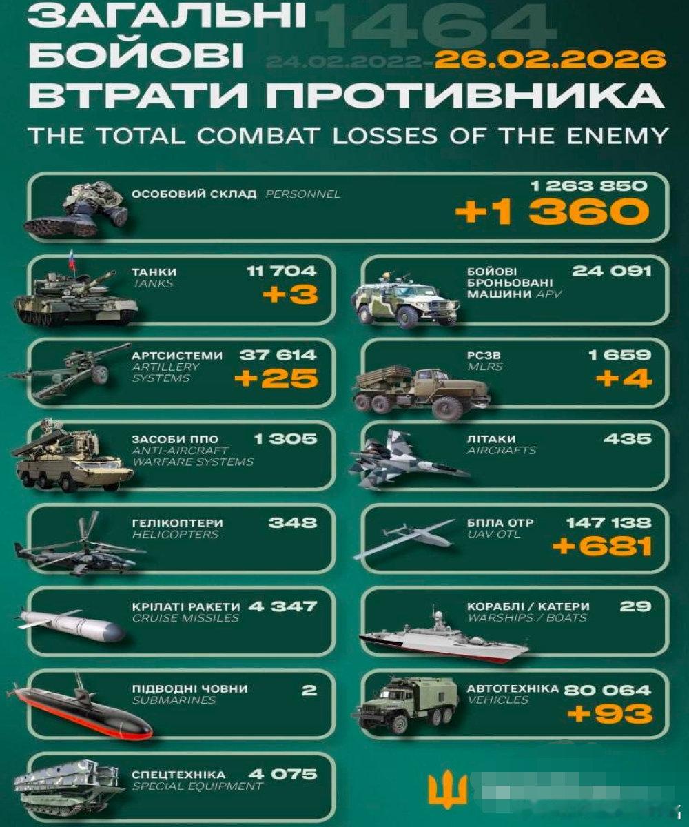 乌俄战争进入第1464天,乌克兰总参谋部发布战报:过去24小时乌俄双方交战92次,其中14次在胡利亚伊波列(22次在苏梅)、18次在托列茨克、7次在莱曼、27次在波克罗夫斯克、4次在南顿涅茨克区域。毙伤俄1360名。俄军累计损失1263850人。摧毁俄3辆坦克、25门火炮、4个火箭发射装置、681架大型无人机、93辆军车。