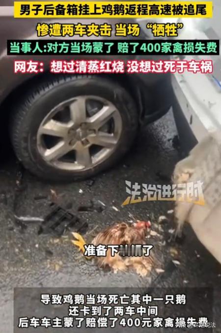 湖南永州,胡先生返城时,年迈的父母非要他把一只活鸡和活鹅带回去,胡先生将它们挂在车后面,半路发生车祸鸡和鹅被后车撞得归西了!虽然对方赔了他400块钱,但是,被撞死的鸡和鹅归谁呢? 春节返程高速上,胡先生正开着车往家里赶。他的后备箱没关严实,两根麻绳从箱盖缝隙里伸出来,下面晃晃悠悠地挂着编织袋和竹笼,里面装的,是一只大公鸡和一只大白鹅。 这俩家伙是胡先生从老家带回来的,临走的时候推搡了很久,无奈拗不过年迈的父母,只能带回城那个小家。 其实每年春运返程,外出离乡的都会在后备箱中塞满老家的年货,但对于活禽来说,放在车里有很大的异味,一些人另辟蹊径,会把它们外挂在后备箱外面。 胡先生一合计,也是把鸡和鹅挂在了后备箱外头,想着高速也就三四个小时,风是大了点,但总比闷在车里强。 一路上鸡和鹅倒也挺安静,胡先生从后视镜里瞥见,还觉得挺有年味。可他没想到,这一挂,挂出了一场事故,也挂出了一个让网友吵翻天的法律问题。 事故发生在下午三点多,高速上开始出现返程高峰的苗头,车距越来越近,刹车灯一片接一片地亮。 胡先生正跟着前车减速,突然“砰”的一声,车身猛地一震,被追尾了。他赶紧下车一看,后保险杠凹进去一块,后备箱盖变形,编织袋和竹笼没事,鸡和鹅却已经没了动静,显然是当场归西了。 追尾的是一辆SUV,司机连声道歉,说刚才看了眼手机导航,没刹住。交警很快到现场,认定后车全责,双方协商赔偿。 鸡和鹅怎么赔?年轻人倒也爽快,问胡先生这俩值多少钱。 胡先生想了想说,鸡是土鸡,养了一年多,市场价少说一百;鹅是正宗狮头鹅,买的时候花了二百多,养了俩月,怎么也得值三百。年轻人没多计较,直接转了四百块钱过去。 事故处理完,俩人在路边站着,看着地上那两只鸡和鹅,突然同时冒出一个问题:这鸡和鹅,现在归谁? 胡先生本能地想收拾起来带走,毕竟是自家的东西,就算死了,拿回去炖了也不浪费。 年轻人却迟疑了一下,开口说:“大哥,钱我已经赔给你了,这鸡和鹅,是不是应该归我?” 胡先生一愣,觉得这话好像也有道理,但又总觉得哪儿不对,钱是赔的损失,东西还是我的吧? 俩人站在寒风里,谁也没动手,最后还是年轻人摆了摆手:算了算了,就两只鸡鹅,你拿走吧。 胡先生这才把鸡和鹅装进袋子里,塞进后备箱,开车离开。 事情本来就这么过去了,可胡先生回到家,越想越觉得有意思,随手拍了张照片发到网上,配文问:“追尾赔了钱,鸡鹅归谁?在线等答案。” 没想到,这条帖子火了。评论区里吵成一片,有人说,谁赔钱谁拿走,这还用问。 有人反驳,赔偿是赔偿,东西还是原主人的。 还有人开玩笑,鹅要是活着,是不是还得算精神损失费? 争论越来越热闹,甚至有人艾特了专业人士,想听听专业意见。 这事看着像段子,其实还真不是鸡毛蒜皮。 法律上,鸡鹅在事故里属于“车载物品”,是财产的一种。肇事方赔了钱,填补的是物主的损失,按照“损失填平”的原则,物主拿到赔偿后,财产状态就恢复到了事故前。 那受损的鸡鹅本身呢?它们的残余价值,应该跟着赔偿走,也就是说,肇事方赔了钱,就有权拿走这些东西。这叫“物上代位”,简单讲就是:你赔了鸡的钱,鸡就归你。 当然,现实里很少有人为了一只鸡一只鹅较真。但换个角度想,如果这不是鸡鹅,而是一块名表、一件古董呢?赔偿金的归属和受损物的归属,就不再是随便能含糊的事了。 这事在网上越传越广,有人调侃“鹅生艰难,死后归属还成谜”,也有人认真分析法律关系。但更值得说的,其实是另一个角度:胡先生把鸡鹅挂后备箱,本身就违法。 根据《道路交通安全法》,车载物品不能遮挡号牌,不能超宽超高,更不能遗洒飘散。 鸡鹅挂在外面,万一掉下来,或者像这次一样被撞飞,不仅自己有损失,还可能引发二次事故。 其实法律早就给了答案。赔偿的目的是填平损失,不是让物主两头占便宜。 拿到全额赔偿的那一刻,受损物的所有权就自动转移给赔偿方。这个逻辑,放在鸡鹅身上是段子,放在贵重物品上就是原则。 可话说回来,法律归法律,人情归人情。四百块钱,两只家禽,换谁也不好意思在高速路上掰扯所有权。最后谁拿走,谁炖了,谁吃了,都不如一句“人没事就好”来得实在。 对于此事,您怎么看?欢迎留言交流。