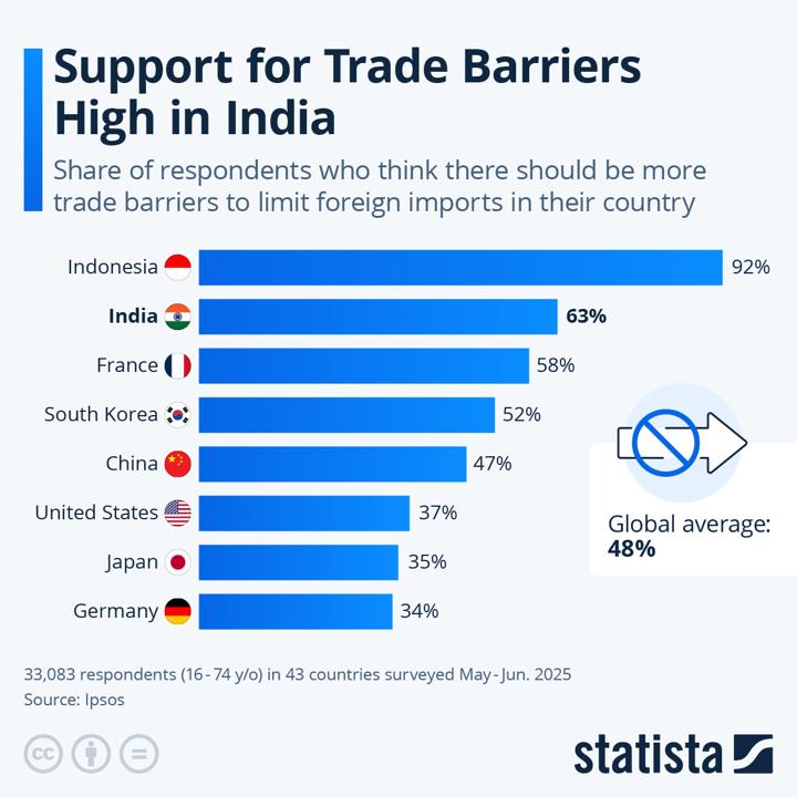 印度民众对贸易壁垒的支持度较高 白宫发布了针对 2 月 6 日首次宣布的美印贸易协议的修订版情况说明,其中包含了对原框架的关键修改内容。原情况说明于 2 月 9 日发布时提到印度将取消其数字服务税,但这一说法现已删除。印度目前在全球贸易政策方面正处于一个关键的转折点,它需要在国内保护主义情绪与国际商业的必要性之间进行权衡。 根据益普索全球趋势调查的最新数据,63%的印度人认为应当设置更多贸易壁垒以限制外国商品和服务的进口,这一比例远高于全球平均水平的48%。如下面的图表所示,支持设置更多贸易壁垒的意愿在印度尼西亚最高,超过九成的受访者(92%)表示赞成此类措施。在其他得分也高于平均水平的国家中,法国(58%)和韩国(52%)的支持率更高,而中国则略低于平均水平(47%)。 印度的这一立场反映了非洲和亚洲众多新兴经济体所呈现出的普遍趋势,即许多国家将贸易壁垒视为抵御外国产品倾销的手段,因为这些倾销行为会冲击其脆弱且往往陷入困境的本土经济。在朝着全面贸易协议的谈判过程中,印度很可能会继续维持这种谨慎的平衡策略,有选择地开放市场,同时保留那些符合其民众偏好、具有战略意义的保护措施。