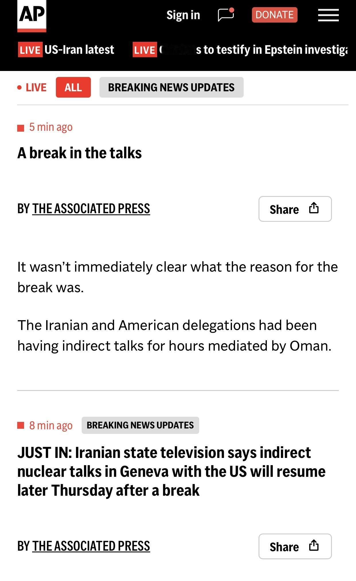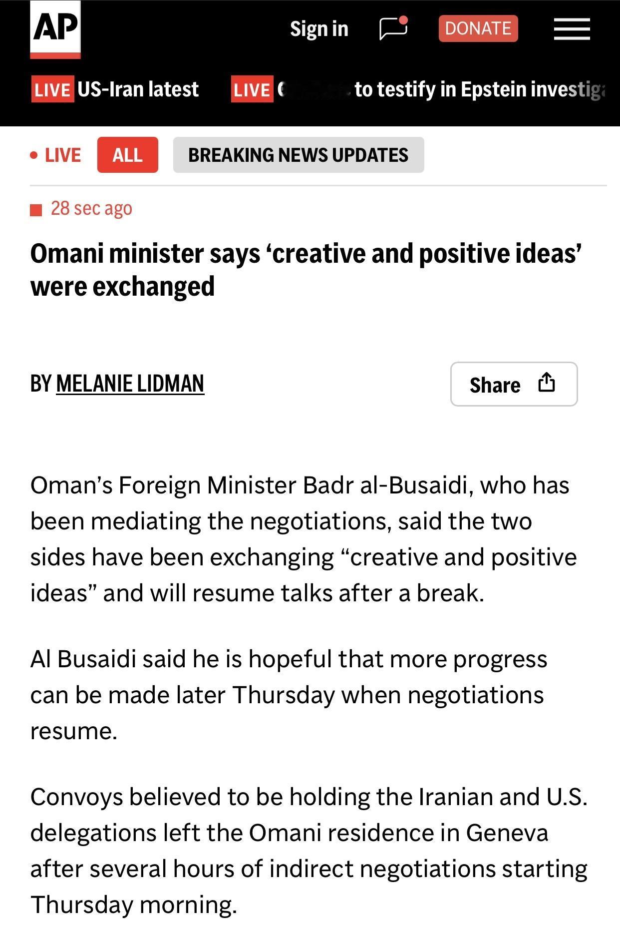 美联社:美伊谈判暂停 阿曼外长说”休息后再谈” 美联社2月26日电:一直在调解谈判的阿曼外交大臣巴德尔·布赛迪表示,双方一直在交流“富有创意且积极的想法”,并将在休息后恢复谈判。 布赛迪表示,他希望周四晚些时候谈判恢复时能取得更多进展。据信,载有伊朗和美国代表团的车队在周四上午开始数小时的间接谈判后,离开了阿曼驻日内瓦的住所。 目前尚不清楚谈判中断的原因。此前,伊朗和美国代表团在阿曼的调解下进行了数小时的间接会谈。 电文说,最新讯息是据伊朗国家电视台表示,与美国在日内瓦的间接核谈判,将在周四中断后稍后恢复(JUST IN: Iranian state television says indirect nuclear talks in Geneva with the US will resume later Thursday after a break)。 电文说,美国外交官似乎已经离开了主持会谈的地点。据信,一支载有美国外交官的车队离开了位于日内瓦的阿曼外交官邸,该官邸当时正在就伊朗核计划问题与伊朗进行间接会谈。目前尚不清楚当天的会谈是否已经结束。伊朗和美国代表团已在官邸逗留数小时。