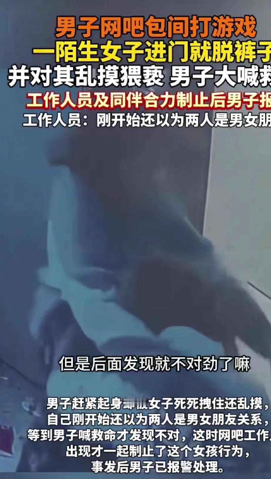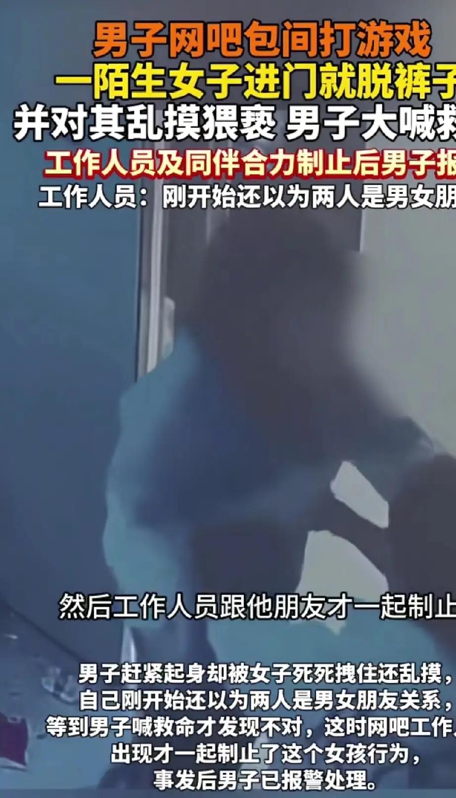 “这算违背男士意愿吗?”湖南岳阳,两名男子在网吧包间打游戏,突然进来一陌生女子,不仅将自己的裤子往下拉,还在其中一名男子身上乱摸。男子呼喊救命后,最终在网吧工作人员的合力制止下,才得以控制,此事听着匪夷所思,却又真实发生了。 2026年2月24日下午,岳阳一家网吧的独立包厢里,两个年轻小伙正戴着耳机,沉浸在游戏世界里。包厢门没关严,留了道缝。谁也没想到,一个陌生女子会突然推门闯进来。 女子看起来二十多岁,她一句话不说,径直走到其中一个小伙身边。接下来的举动,把两个人都吓傻了。她当场开始解自己的裤子,动作很快,直接把裤子脱到了膝盖位置。 小伙整个人都僵住了,旁边的朋友也懵了,盯着屏幕,手都忘了动。女子好像完全不在意他们的反应,转身出去搬了把椅子,又回到包厢。她把椅子紧挨着小伙放下,一屁股坐上去,还把腿搭在了小伙身上。 冰凉的手碰到胳膊,小伙这才慌忙起身想躲开,却被女子一把拽住了手臂。女子趁机在他身上乱摸,手往胸口伸,还试图去扯他的衣领。小伙拼命挣扎,声音带着哭腔大喊“救命!救命啊!” 包厢外的其他顾客听到了动静,有人探头看了一眼。起初大家都以为是情侣吵架,小打小闹,没太在意。直到那声“救命”大家才意识到不对劲。 网管闻声赶过来,推开包厢门,也被眼前的场景弄愣了。本想说一句“小情侣有话好好说”,可越看越不对,这根本不像是闹别扭的样子。 网管赶紧收起笑容,和小伙的朋友一起,两人合力才把女子架开,控制住拉到了大厅。女子被制止后,情绪依然很不稳定,还想往包厢方向冲,精神状态看起来可能不太正常。网吧方面后来回应,工作人员一开始误判了,以为是熟人间的争执,所以没有立刻上前。直到确认双方根本不认识,才马上采取了措施。 事情很快传到了网上,最火的一条评论是:“以前总提醒女孩子注意安全,现在男孩子出门也得保护好自己了。”我们好像默认了,性骚扰的受害者只能是女性。男性遇到这种事,往往不被重视,甚至可能被调侃“占了便宜”。但是法律保护的是“他人”,不分男女。只要违背你的意愿,侵犯你的身体,就是不对的。 经营者有责任保障顾客的安全,不能因为主观觉得“可能是情侣”,就放任不管。等到伤害发生了,再补救就晚了。对于受害者来说,像那个小伙一样,当场大声呼救、果断报警,是最正确的选择。不要因为羞耻或顾虑而沉默。每个人的身体,都是不容侵犯的。尊重这条边界,是文明社会最基本的底线。 各位读者你们怎么看?欢迎在评论区讨论。