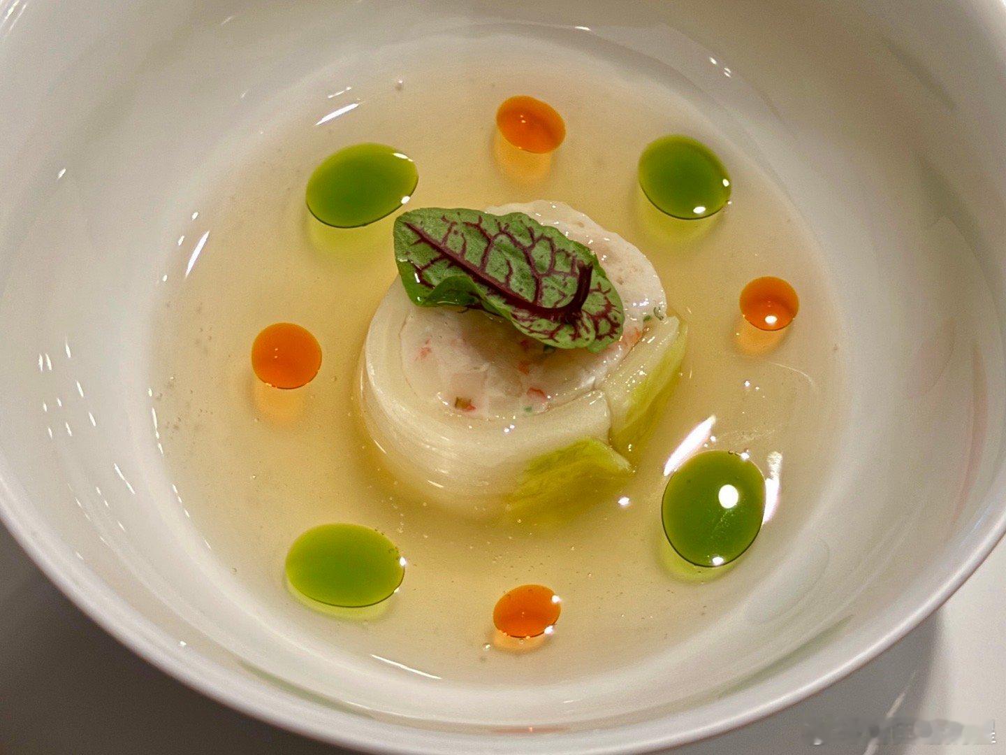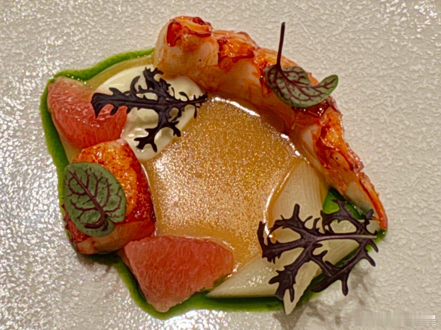 这是一家还不错的餐厅,说菜:首先是发酵咸粥和七种点心。图1是两种鱼脆片和五个点心,虾肉塔不错,脆米芝士球和萝卜苹果泥也可以。图2是辣油凤尾鱼高汤和菜皮海鲜饺子,不错,口味非常东亚风。图3是韩式酸汁鱼生,鱼是日本島鯵,有特色。图4小吃是甜面包鲍鱼卷,用一个大袋子装上来的,甜口热馅,味道不错。