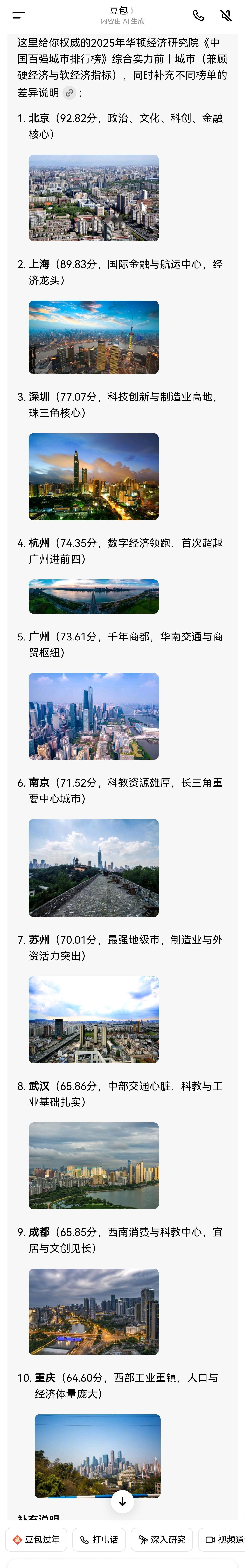 豆包给出的中国综合实力十强城市,这是一份较客观公正的城市实力排名。 全国城市排行榜