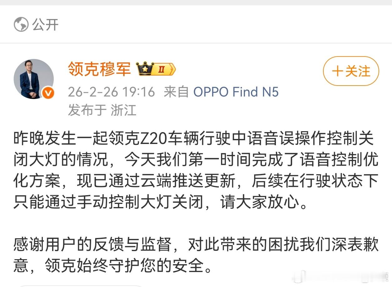 领克Z20行驶中语音关闭大灯,这是极大的安全问题。