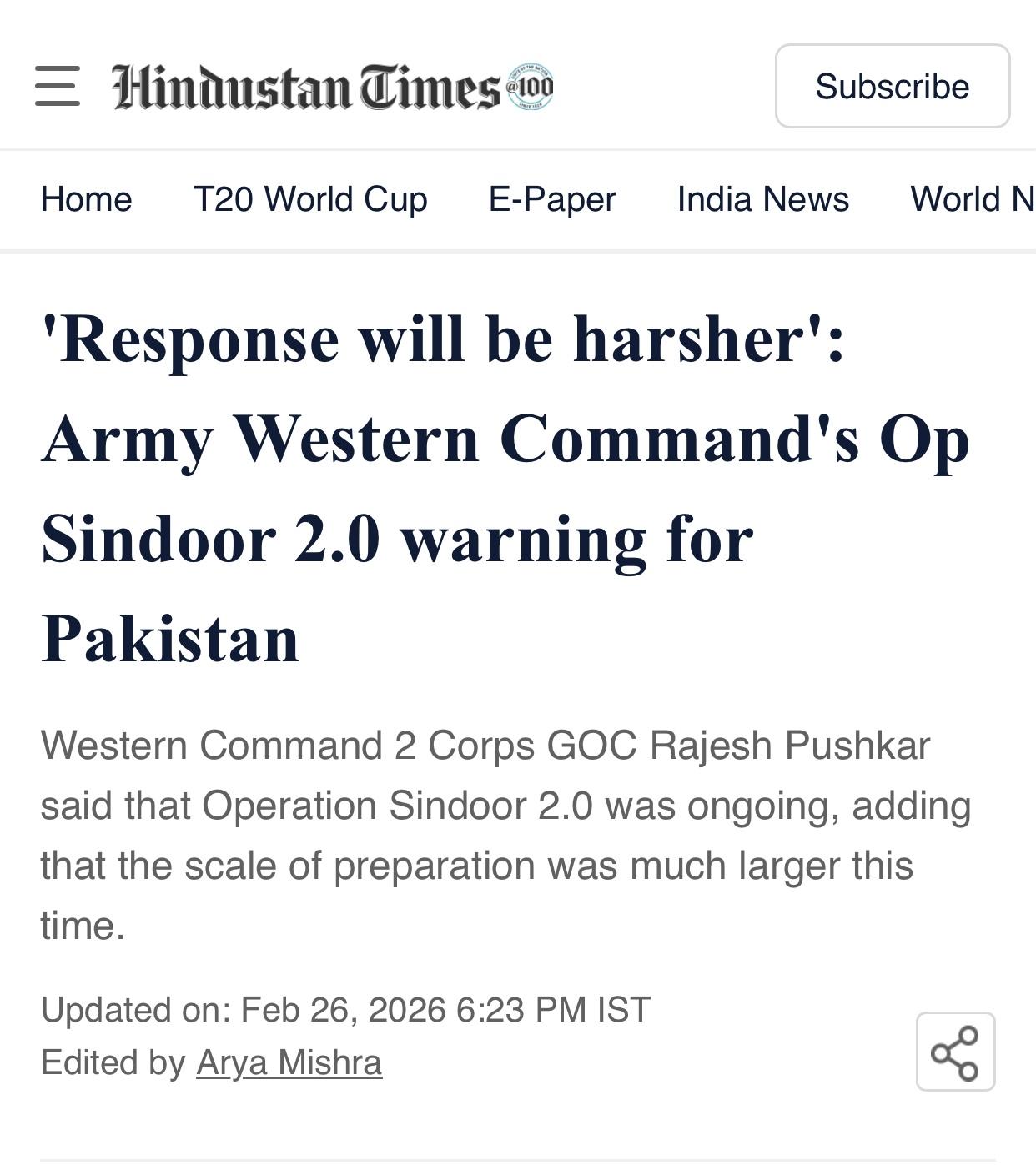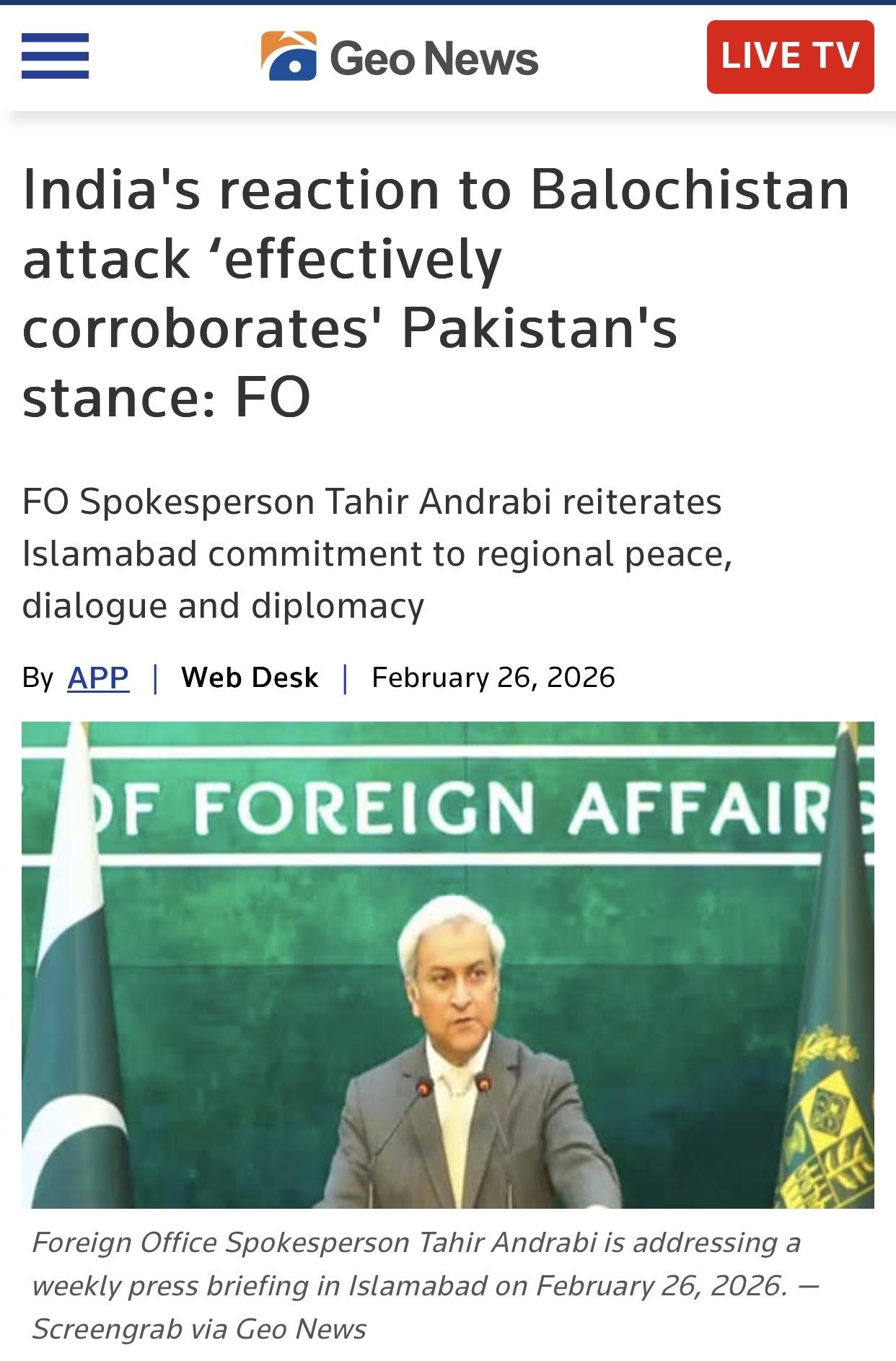 巴媒:巴外交部发言人说”坚定捍卫国家安全” 印媒:”硃砂行动2.0”已展开且规模更大 巴基斯坦GEO电视台官网2月26日报道:巴基斯坦外交部发言人周四表示,印度对俾路支省近期恐怖袭击事件的反应“实际上证实了”巴基斯坦长期以来有关外部势力参与破坏稳定活动的立场。 报道说,上个月,俾路支解放军(the Baloch Liberation Army,已被中国、美国、英国、欧盟、巴基斯坦等国定为恐怖主义组织—译者注)在俾路支省的几个地区发动了多次袭击,造成22名安全人员和36名平民死亡。 报道说,巴基斯坦三军公共关系局(ISPR)在1月31日的一份声明中表示,由印度资助的“印度之乱”(Fitna al-Hindustan,FAH)恐怖分子在奎达、马斯吞、努什基、达尔班丁、哈兰、本杰古尔、通普、瓜达尔和伯斯尼等地,针对平民发动了多次袭击。巴基斯坦安全部队和执法机构立即作出反应,在全省范围内展开了密集的清剿行动,击毙了92名印度支持的恐怖分子,其中包括三名自杀式炸弹袭击者。 巴基斯坦外交部发言人塔希尔·安德拉比比在今天的每周媒体吹风会上重申,巴基斯坦致力于地区和平、对话和外交,同时坚定捍卫国家利益和在国际争端上的原则立场。 发言人还回顾说,本月是萨姆霍塔特快列车爆炸案(the Samjhauta Express bombing)发生19周年,该案导致70多人丧生(注:列车爆炸案是2007年2月19日发生在印度与巴基斯坦之间国际列车上的恐怖袭击事件—译者注)。他表示,涉案人员之一斯瓦米·阿西曼南德已公开承认参与其中,而印度上校什里坎特·普罗希特也承认了自己的角色。然而,他补充道,萨姆霍塔特快列车案中的四名被告目前均未落网。 安德拉比表示,印度未能将参与袭击的人员绳之以法。他强烈反对印度外交部最近发表的声明,称巴方指责毫无根据。 报道的原标题是《India's reaction to Balochistan attack ‘effectively corroborates' Pakistan's stance: FO》(印度外交部称,印度对俾路支袭击事件的反应“实际上证实了”巴基斯坦的立场)。 另据《印度斯坦时报》官网2月26日报道:印度陆军西部战区司令部警告巴基斯坦,会采取比上次“更严厉”的回应,同时强调“硃砂行动2.0”(Operation Sindoor 2.0)正在进行中。 报道说,在印控克什米尔的帕哈甘村恐怖袭击事件导致26人死亡后,印度武装部队于去年5月发起了“硃砂行动”。随后,印度武装部队对巴基斯坦和巴控克什米尔的恐怖主义基础设施发动了精确军事打击。 报道说,第二集团军军长拉杰什·普什卡尔中将表示,”硃砂行动”已经向巴基斯坦传递了强烈信息,但“硃砂2.0行动”仍在进行中,且此次的准备规模要大得多。 “我们在行动中给巴基斯坦提供了一个非常小的例子,仅仅四天时间,他们就屈服,并致电我们的军事行动总指挥官,要求停止这场战争……这是一个非常小的例子,其目的在于展示一下”,普什卡尔中将告诉记者。这位军官是在旁遮普省帕坦科特举行的西部司令部备受瞩目的作战能力演示(Operational Capability Demonstration in Punjab's Pathankot)时发表上述言论的。 “‘硃砂行动’正在进行中……‘硃砂行动2.0’的准备工作相当充分。我现在还不能告诉你这次行动将如何展开,因为这将取决于我们想要对敌人造成多大的伤害。无论是何种形式的伤害,无论是在陆地、海上还是空中,我们都随时准备付诸行动”,他续说道。 报道说,另一位印军高级军事官员也表示,对巴基斯坦的任何挑衅都会引起“更强烈”的报复。 印度西部战区总司令马诺伊·库马尔·卡蒂亚中将表示,印度将不再被巴基斯坦的“核虚张声势”所吓倒。他表示,巴基斯坦总理谢赫巴兹·谢里夫“想要阻止”印度陆军采取强硬行动。 他进一步强调了西部战区司令部在”硃砂行动”中的成功,并表示印军确信,今后必须“比......上次要更严厉地做出回应”。 他说道:“在‘硃砂行动’中,我们袭击了他们(巴基斯坦)所有的恐怖分子基地……之后,他们进行了报复,作为回应,我们摧毁了他们的军事基地和空军基地。他们随后要求停火,不仅直接向我们,还向其他国家要求与印度停火”。 报道的原标题是《'Response will be harsher': Army Western Command's Op Sindoor 2.0 warning for Pakistan》(“回应将更为严厉”:印度陆军西部战区司令部对巴基斯坦发出“硃砂2.0”行动警告)。
