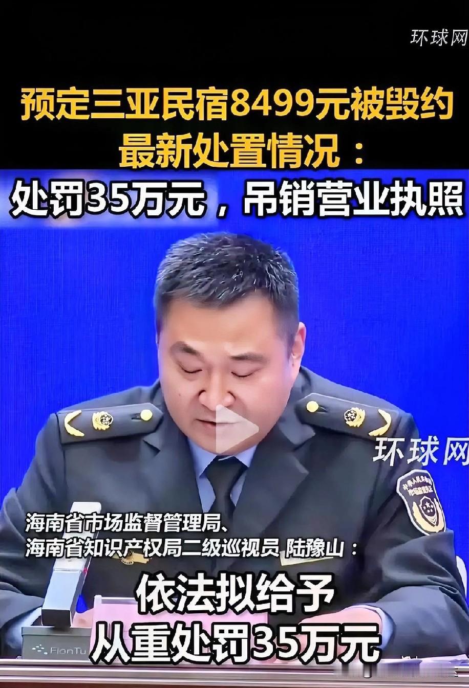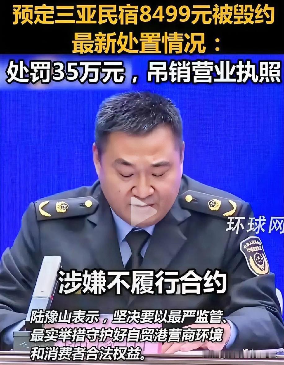 就在刚刚,万万没想到是:那个毁约的三亚民宿被重罚35万元,还吊销了营业执照,被列为失信名单了。事情的起因是一男子提前几个月就订好了19天8499元的民宿。但是商家临时通知毁约,涨价把房子租给了别人。男子因为已经买好了机票,和家人规划好了行程。所以非常的生气,就给发到了网上。 消息一出瞬间引爆全网,网友们纷纷拍手叫好,这不是一次普通的纠纷处理,而是监管部门对旅游市场恶意毁约乱象的雷霆亮剑,也让坚持维权的普通游客,迎来了最解气的结果。 这位游客的遭遇戳中了无数出行人的痛点,提前数月敲定住宿、付清费用、订好机票,全家的假期计划环环相扣,商家却为了多赚差价,随手撕毁合同,把消费者的信任与安排抛在脑后。 2月26日海南官方新闻发布会正式通报,监管部门认定民宿未按合同履约,损害消费者合法权益,处以35万元罚款、吊销营业执照、列入严重失信名录,这是近年来当地同类案件中的顶格处罚。 春节假期海南全省受理旅游消费诉求超6195件,为消费者挽回经济损失44.3万元,民宿毁约是高发乱象之一,以往多以退款了事,商家违约成本极低,才让这类行为屡禁不止。 商家眼里只有旺季的溢价利润,为了几千块的差额,甘愿丢掉经营资格、背负失信污点,这份短视与贪婪,既违背商业道德,也触碰了法律红线,最终搬起石头砸了自己的脚。 列入失信名单的惩戒远比罚款更有力度,涉事经营者后续在贷款、合作、市场准入等多个环节都会受到限制,真正实现一处违法、处处受限,让无良商家付出长远代价。 游客没有选择忍气吞声,而是把经历公之于众,用舆论推动问题解决,这给所有消费者做出了示范,面对恶意毁约、坐地起价,保留凭证、勇敢发声,就能守住自己的合法权益。 旅游平台也该从中吸取教训,不能只负责上架房源、收取佣金,更要加强对商家的约束与监管,对违约商户及时下架处理,用严格的规则守护消费者的预订安全。 三亚作为全国顶流旅游目的地,口碑远比短期利益更重要,一次宰客、一次毁约,可能毁掉游客对一座城市的好感,净化市场环境,才能让游客放心来、安心玩。 契约精神是旅游行业的立身之本,民宿生意靠的是口碑与回头客,靠坑蒙拐骗赚快钱,注定走不长远,只有诚信履约、用心服务,才能在行业里长久立足。 这次顶格处罚不止针对一家民宿,更是向全国旅游行业发出明确信号,任何欺客宰客、恶意违约的行为,都会被严厉打击,监管的红线谁都不能踩。 普通游客出门在外,要的不过是一份安心与尊重,一份生效的订单、一句信守的承诺,远比虚高的价格更有温度,这也是大众为这次处罚齐声点赞的原因。 法治撑腰、监管发力、舆论监督,三者共同筑起消费者权益保护墙,旅游市场才能告别乱象,回归服务本质,让每一段出行都不被辜负,每一份信任都不被践踏。 各位读者们对这件事怎么看? 请在评论区留言。