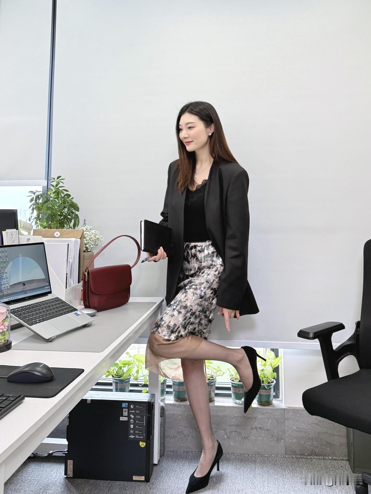 春季通勤职场OOTD~ 黑西装+蕾丝内搭+亮片裙 日常通勤又不失时尚 姐姐好飒!