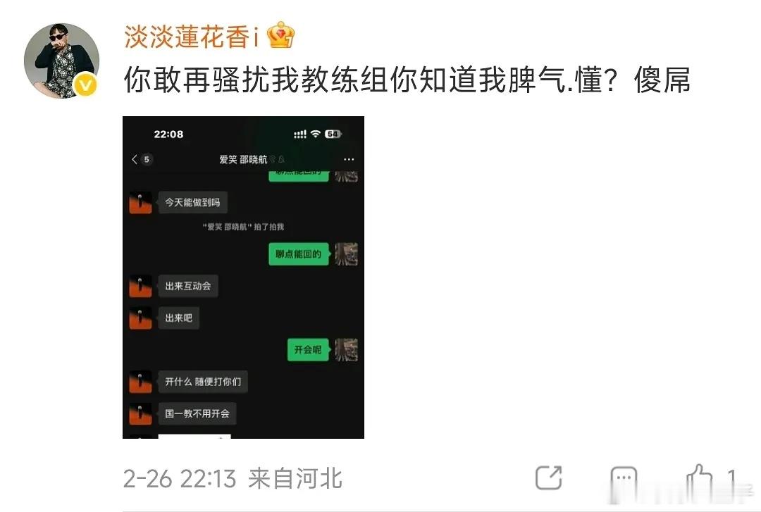爱笑因为蓝莲花曝光聊天截图被骂,又去跟家子正聊天。