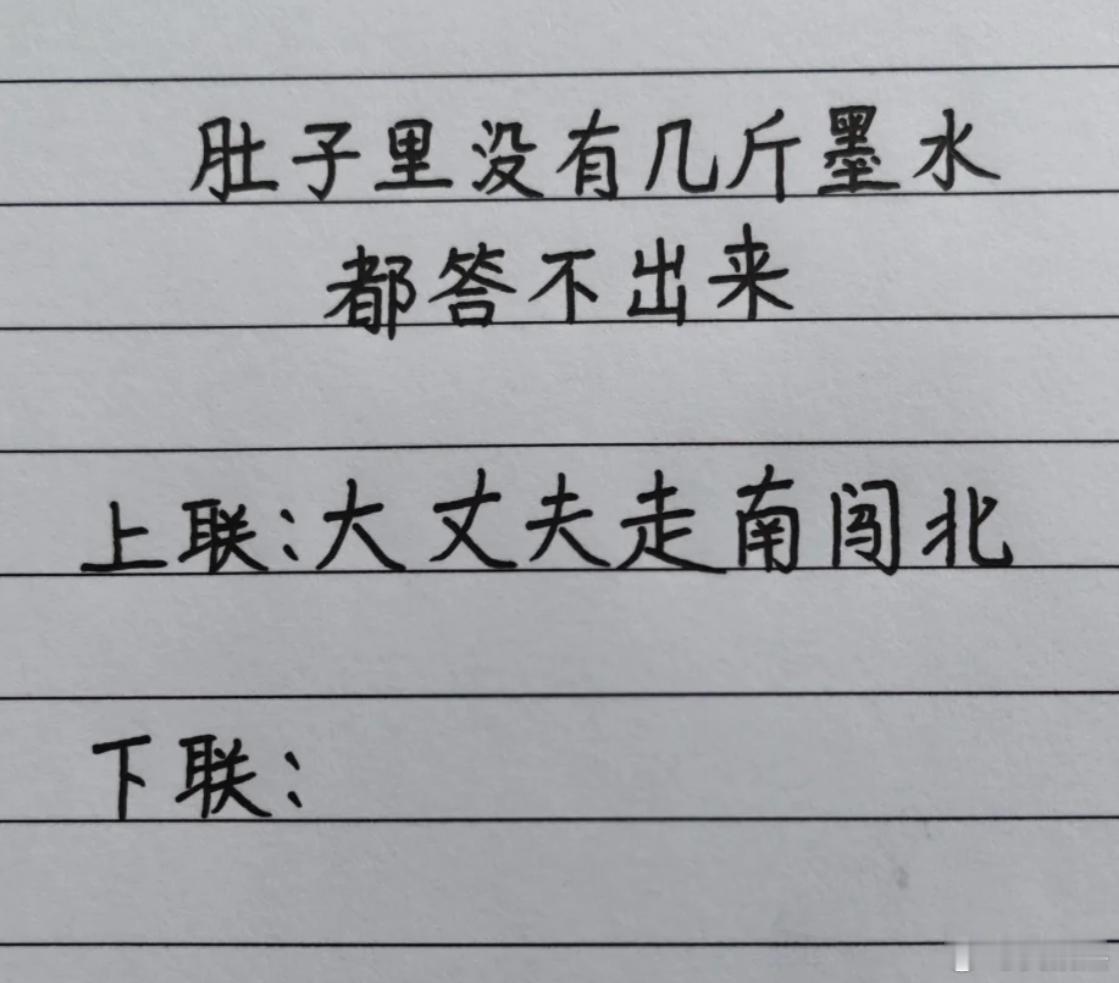 我出上联你对下联,肚子里没有几斤墨水都答不出来。上联:大丈夫走南闯北下联:___