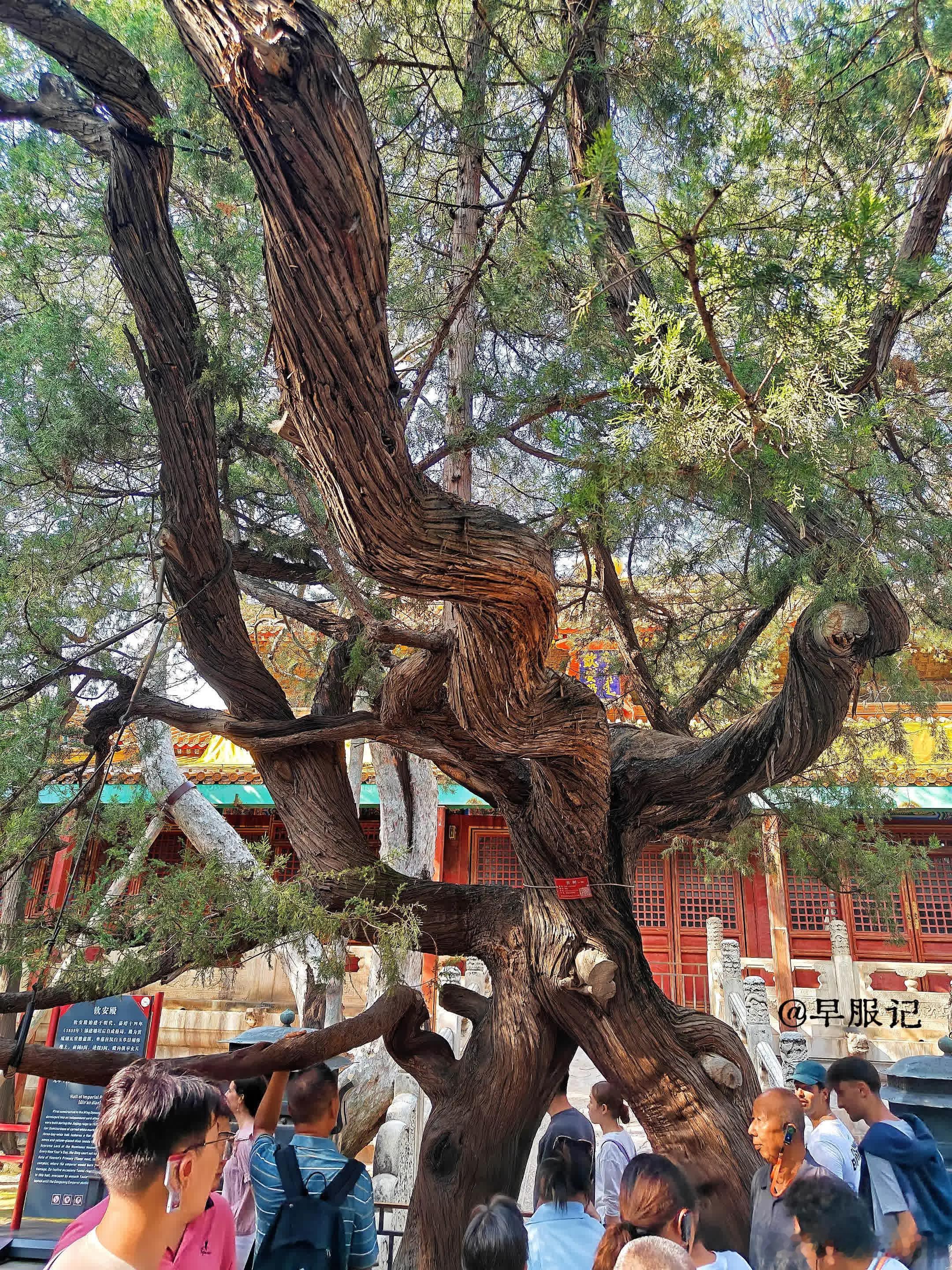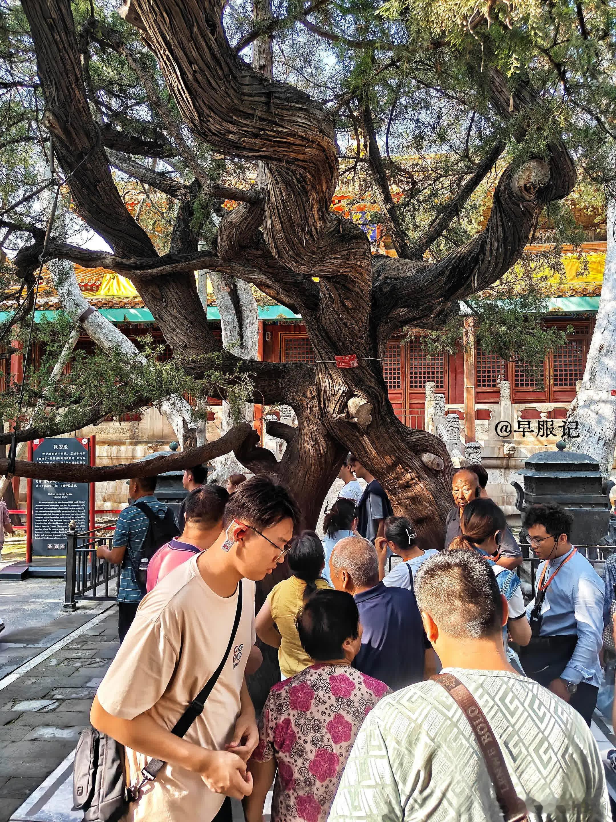 北京故宫御花园排队打卡圣地,非常火爆——天一门内、钦安殿前的「连理柏/人字柏」。百年前,林徽因、泰戈尔,曾在这棵树下合影;末代皇帝溥仪在天一门前摄影。它横跨在北京城中轴线两侧,种植于明代,距今已有400多年历史,一级古树,桧柏科,连理形态是明清时期人工培育而成。 【红色身份证】级别:古树(一级)柏科:桧柏年代:明朝(约400年)编号:110101A01898位置:北京故宫博物院御花园天一门内机构:北京市园林绿化局2017年制 【此连理树寓意】(一)忠贞爱情、心意相通、繁衍子嗣导游通常会强烈安利情侣在这棵连理树下合影,并告知这是“结婚树”“爱情树”。(二)横跨中轴线两侧,人字形躯干:天地人三才、天人合一、天地交泰、阴阳和合(三)王德祥瑞君王德行高尚时出现的瑞应植物,常象征太平盛世,许多古籍都有记载。❶(王者)德至草木,则木连理❷王者德泽纯洽,八方同一,则木连理,连理者,仁木也,或异枝还合,或两树共合❸王者德化洽八方合为一家,则木连理❹王者不失民心,则木连理 【连理柏形成方式】连理柏的形成有两种方式:第一种,自然形成。两棵树距离比较近,它们相贴近的树枝由于风吹雨打,最终长到了一起。第二种,人工的方法。一般将两棵树相贴近的树枝的皮用刀刮掉一部分,然后将两个枝条靠在一起,再用油布包裹。这样经过长年累月的生长,最终长在了一起,也形成了“连理”的样子。 【故宫连理柏:三孔嫁接法——古代园艺最高成就】故宫御花园里的连理柏共有十余株,多是桧柏科,都是经人工培育而成的。御花园连理柏的嫁接技术,是清代宫廷园艺的最高水平,代表了中国古代园艺的最高成就。它采用的"三孔嫁接法”,复杂度远超同时期欧洲的园艺水平。宫廷匠人运用三孔嫁接法,在两株柏树等高位置凿出等距孔洞,将带有鲜活芽孢的枝条削去表皮后嵌入孔中,以黄泥封裹、马尾膜缠绕,历经数月形成层精准对齐的养护。最险峻的环节在于形成层对齐,稍有偏移便会导致嫁接失败。历史