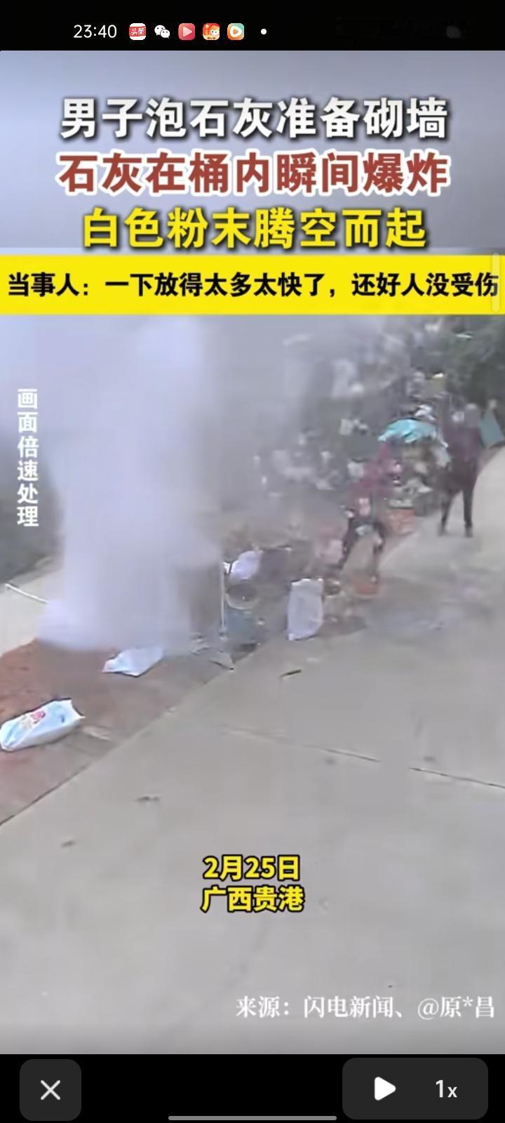 2月25日,贵港桂平市。一男子泡石灰准备砌墙,石灰在桶内瞬间爆炸,白色粉末腾空而起。当事人表示,一下放了四包石灰,倒得太快,桶里的水又少就爆出来了,烟冒的太大而且是滚烫的,还好人没受伤。