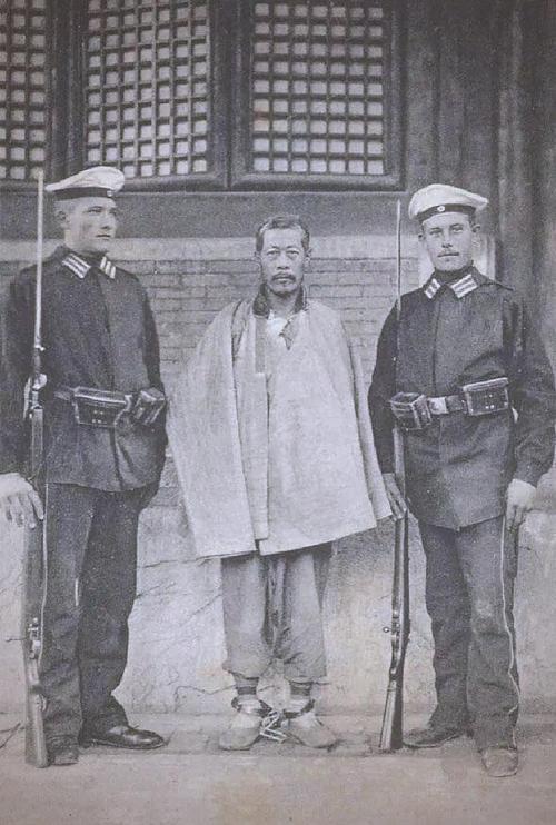 1900年12月31日,北京,清军神机营霆字队章京恩海被德军处决前的最后时刻。恩海时年25岁,他脚戴镣铐,身披一件单薄的外衣,身姿笔挺,直视镜头,毫无惧色。两侧是两名身着海军制服、手持德国Gew.98步枪的德国海军陆战队士兵,他们是这场处决的执行者。 1900年6月20日,德国驻华公使克林德在前往总理衙门的途中,与正在东单牌楼附近巡逻的清军神机营章京恩海相遇。双方发生冲突,克林德率先开枪,恩海还击并将其当场击毙。 八国联军占领北京后,德国方面执意要缉拿凶手。最终,日本人通过克林德遗落的银表在当铺追查到线索,将恩海逮捕。1900年12月31日,德国方面在克林德遇袭地点将公开斩首,以儆效尤。 恩海在自己的国土上,却要接受外国军队的审判和处决,这本身就是晚清中国主权沦丧的缩影。事后,清政府还被迫在克林德遇袭处修建了“克林德碑”,成为近代中国的一大国耻。