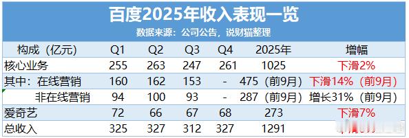 最后来看百度收入下滑的原因——此消彼长:AI相关收入在大幅提升,但传统业务收入下滑,且AI相关收入暂时还不能完全抵消传统收入的下滑。有点鸡贼的是,百度最新财报中,不再披露去年第四季度广告营销收入数据。从前三季度的表现看,在线营销也就是百度的广告收入,下滑幅度最大,减少接近14%。此外,爱奇艺的收入也不如上一年,下滑7个点,拖累了百度。
