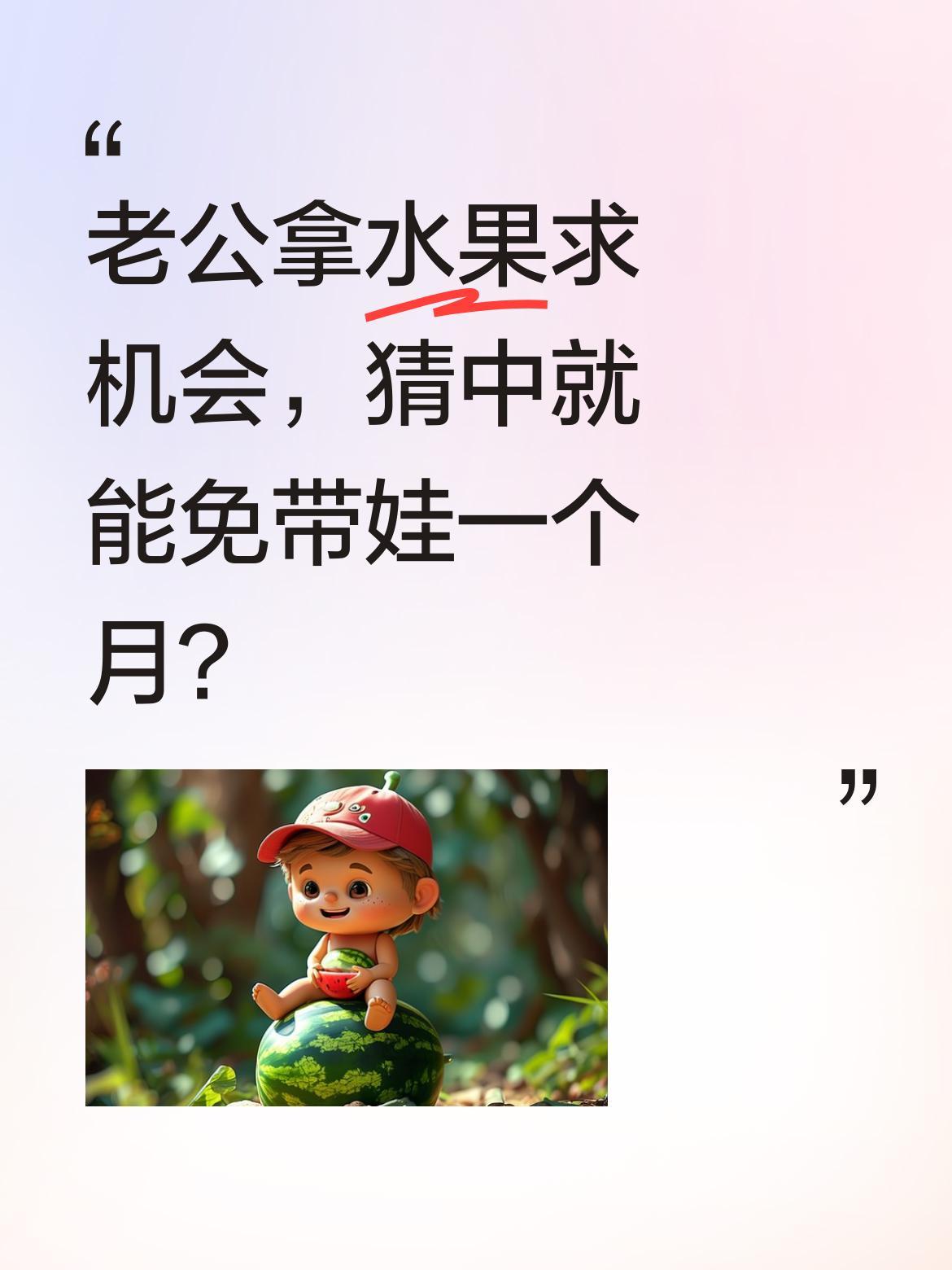 老公拿水果求机会,猜中就能免带娃一个月? 最近有位妈妈分享趣事:老公为了争取一个月"免带娃权",提出让大家猜他手里拿的水果。视频里他反复念叨"苹果apple",看来是志在必得。网友调侃:这是把带娃当"惩罚"了?其实夫妻间偶尔的小互动也挺有意思,你们家带娃有什么小约定吗?