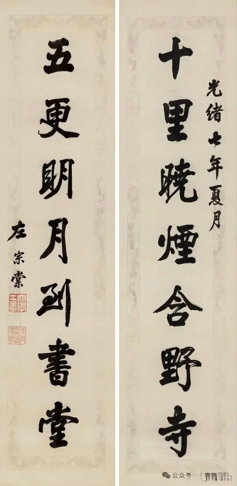 人书合一:左宗棠“十里晓烟”联的晚清风骨与当代启示 晚清名臣左宗棠69岁退居后,写下这副传世楹联:十里晓烟含野寺,五更明月到书堂。 其书法取法颜筋柳骨,笔力沉雄厚重,顿挫间藏湘军风骨,无软媚之态,无狂放之姿,刚劲中含雅逸,真正人书合一。 上联写晨烟笼寺,道尽尘世喧嚣迷茫;下联言明月照堂,守住内心清净坚守。一生戎马倥偬,终归耕读本心,这是左宗棠的人生大智慧。 于今人而言,生活多如十里晓烟,奔波浮躁、前路难辨。可每个人心中,都该有一间书堂、一轮明月。 不必身居高位,不必满腹经纶,只需在喧嚣中守一份心静,在奔波中存一份笃定。这副百年楹联,写的是风骨,照的是你我本心。