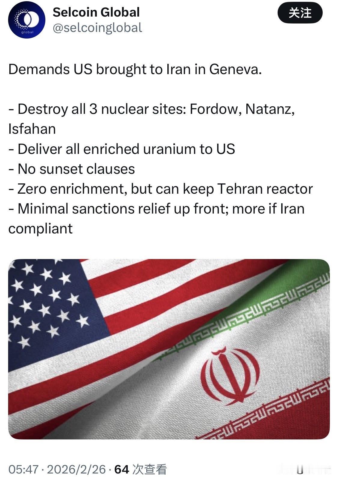 根据《华尔街日报》(WSJ) 2026年2月26日的报道,美国谈判代表在日内瓦举行的核谈判中向伊朗提出了极为严苛的条件。以下是美方要求的核心内容: 摧毁三大核心设施:要求伊朗拆除位于福尔多 (Fordow)、纳坦兹 (Natanz) 和伊斯法罕 (Isfahan) 的主要核设施。这些设施在2025年6月曾遭到美以两国的军事打击,目前美方要求将其彻底废弃。 转移全部浓缩铀:要求伊朗将其剩余的所有浓缩铀库存移交给美国。 永久性限制(无终止条款):美方拒绝接受 2015 年伊核协议(JCPOA)中的“日落条款”,坚持任何协议必须是永久性的,旨在无限期限制伊朗的核能力。 零浓缩政策:坚持伊朗必须停止所有铀浓缩活动。作为极小的让步,美方可能允许德黑兰研究堆在极低浓缩水平下运行,仅用于医疗目的。 制裁豁免机制:美方仅提供极初步的有限制裁豁免。只有在伊朗长期遵守规定并经过验证后,才会考虑进一步放宽制裁。 事件背景: 目前谈判由美国特使史蒂夫·威特科夫 (Steve Witkoff) 和贾里德·库什纳 (Jared Kushner) 领导。特朗普政府通过在地区集结大规模军事力量(包括多个航母打击群)对伊朗施加“极限施压”,并警告若谈判失败将采取进一步军事行动。