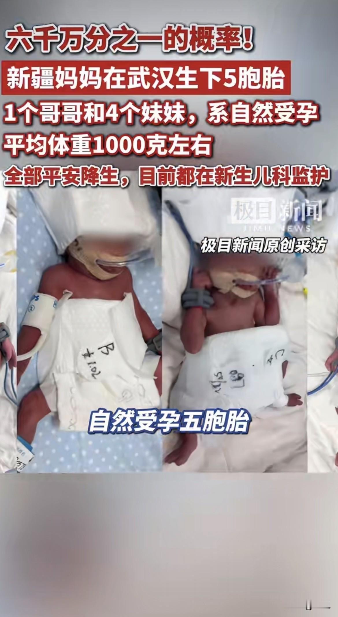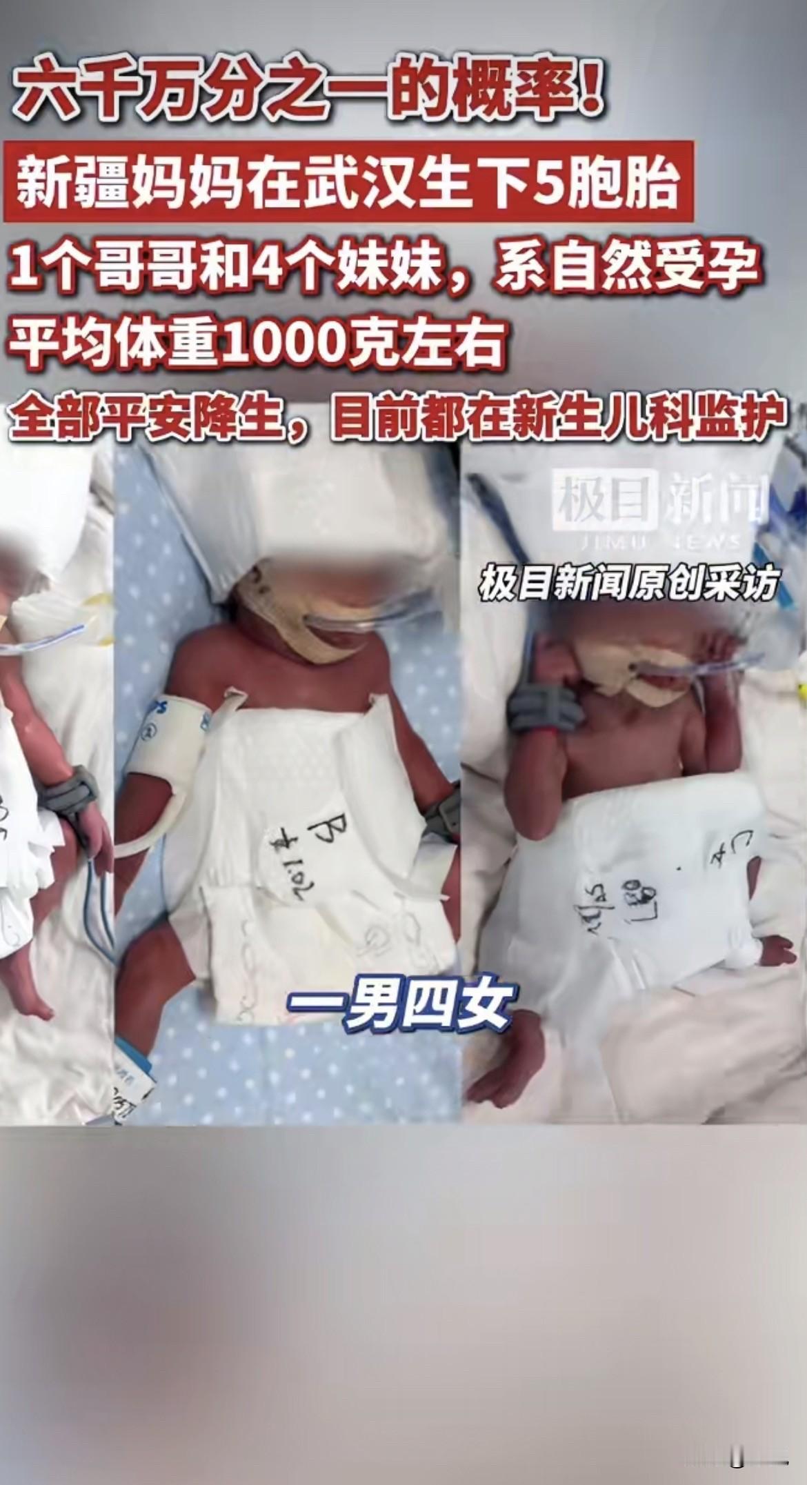 家人们,今天凌晨武汉出了一件大事,有个24岁的新疆姑娘,一口气生了五个娃。 昨晚快12点,这个姑娘肚子突然破了水,救护车一路鸣笛把她拉到武汉大学中南医院。医院那边早就等着了,产科、新生儿科、麻醉科,二十多个医生护士,十五分钟全部到位。 手术灯啪地打开,医生开始剖。第一个出来的是个男孩,990克,哭声还挺响亮。接着四个丫头片子挨个出来,970克、870克、1020克、1030克。最小的那个还不到两斤重,没一只拖鞋沉。 这姑娘才24岁,叫迪丽,从新疆和田来的。为啥跑这么远?因为当地医院不敢接这活。五胞胎,那是开玩笑的吗?孕妇子宫被撑得太大,特别容易早产,生完了还容易大出血收不住。这些风险,她心里门儿清。 她是去年8月怀上的。本来她就有多囊卵巢综合征,特别难受孕,这次能怀上已经是老天爷赏饭吃。结果一查,五个。医生说要不减几个吧,风险太大了。这姑娘舍不得,一个都舍不得。后来她在网上找到一个四胞胎的妈妈,人家给指了条路,说武汉有个李家福医生,专门处理这种高危妊娠。 去年12月,她就和老公来了武汉。李医生当面又劝了一回,还是那句话,风险太高。但这姑娘铁了心,就要全留下。李医生也没再坚持,给她建了个群,产科、新生儿科、麻醉科的专家都在里头,远程盯着她的情况。 今年春节前,她又来了武汉,就等着生。这一等,等到28周零6天,肚子破了。 手术做了一个小时,一切顺利。医生给她用了最厉害的药收缩子宫,还把自己出的血过滤了再输回去,就怕大出血。最后真没出啥事,她今天已经回普通病房了,精神头还不错。 但那五个小的,这会儿都在保温箱里躺着。28周就出来,太小了,肺都没长好。医生说后面还有呼吸关、感染关、营养关,一关一关都得闯。这五个孩子评分都在6分以上,对这么早产的来说,已经算不错了。 多胎妊娠,医学上就叫高危妊娠。子宫过度伸展,很容易早产,生完后子宫收缩不好,就容易大出血。全球自然受孕五胞胎的概率,六千万分之一。这个妈妈把一辈子的运气,都用在这一回了。 现在问题来了——一下子多了四个小姨子一个小舅子,这日子以后怎么过?你们觉得这五个孩子,是来报恩的,还是来讨债的?