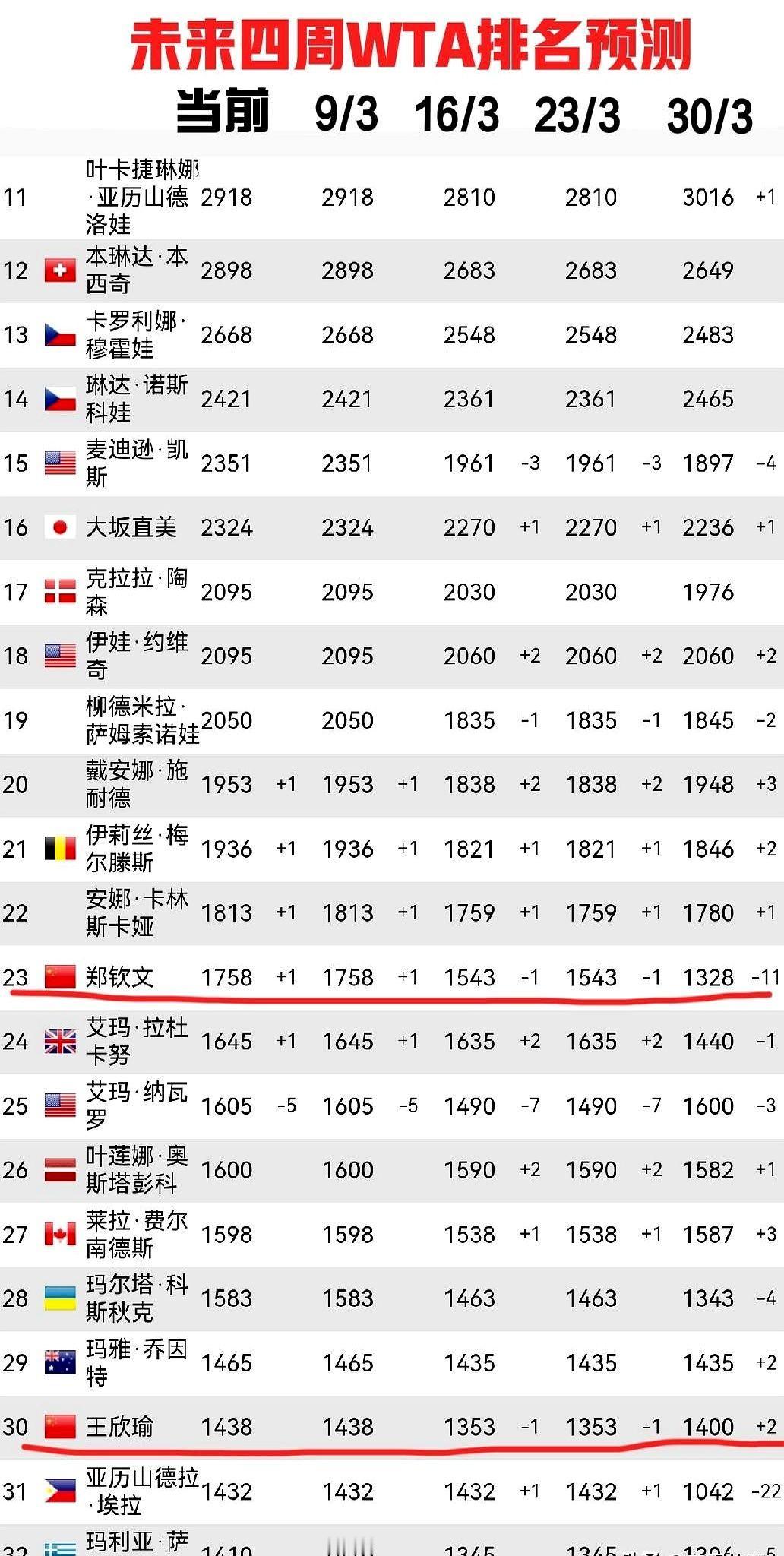 王欣瑜要超郑钦文?这事没发生!之前预测王欣瑜会在三月底反超郑钦文,甚至排名升到28位,郑钦文跌到34位。结果呢? 最新排名显示,王欣瑜1438分排第30,郑钦文1758分排第24,两人还差320分。预测和现实完全反着来。 王欣瑜虽然刷新了个人最高排名到第30,但她在阳光赛季首站奥斯汀赛首轮就出局。郑钦文还在养伤,排名相对稳定。 所以,短期内王欣瑜想超越郑钦文,难度不小。别听风就是雨,看清事实很重要。