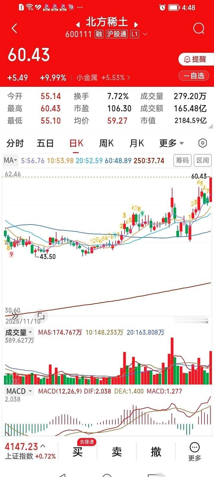 老天爷大概是想按着我的头,让我再多赚点。 就差一分钱。 真的,就一分钱。 上午看着北方稀土跟疯了一样往上冲,心怦怦跳,我寻思着差不多得了,落袋为安,见好就收吧。 随手挂了个60.44的卖单,然后就去忙别的了。 结果中午吃饭的时候打开一看,好家伙,红彤彤的涨停板,封得死死的。 但我的单子,还好端端地挂在那儿,一股东没卖掉。 我当时就懵了,反复确认,咋回事儿啊? 定睛一瞧,涨停价60.43。 我,挂的,60.44。 我真是个天才。 那一瞬间,我都不知道该哭还是该笑。本来是想秀个操作,结果成了“乌龙指”,自己把自己给“套”住了。 但现在再看,这哪是乌龙指啊,这简直是上帝之手,拦了我一下。 行吧,不卖了。 既然市场这么给面子,用这种方式给我留下了,那咱就格局打开,再拿一拿。 你说,人生的很多惊喜,是不是都是从这种阴差阳错的“失误”开始的?