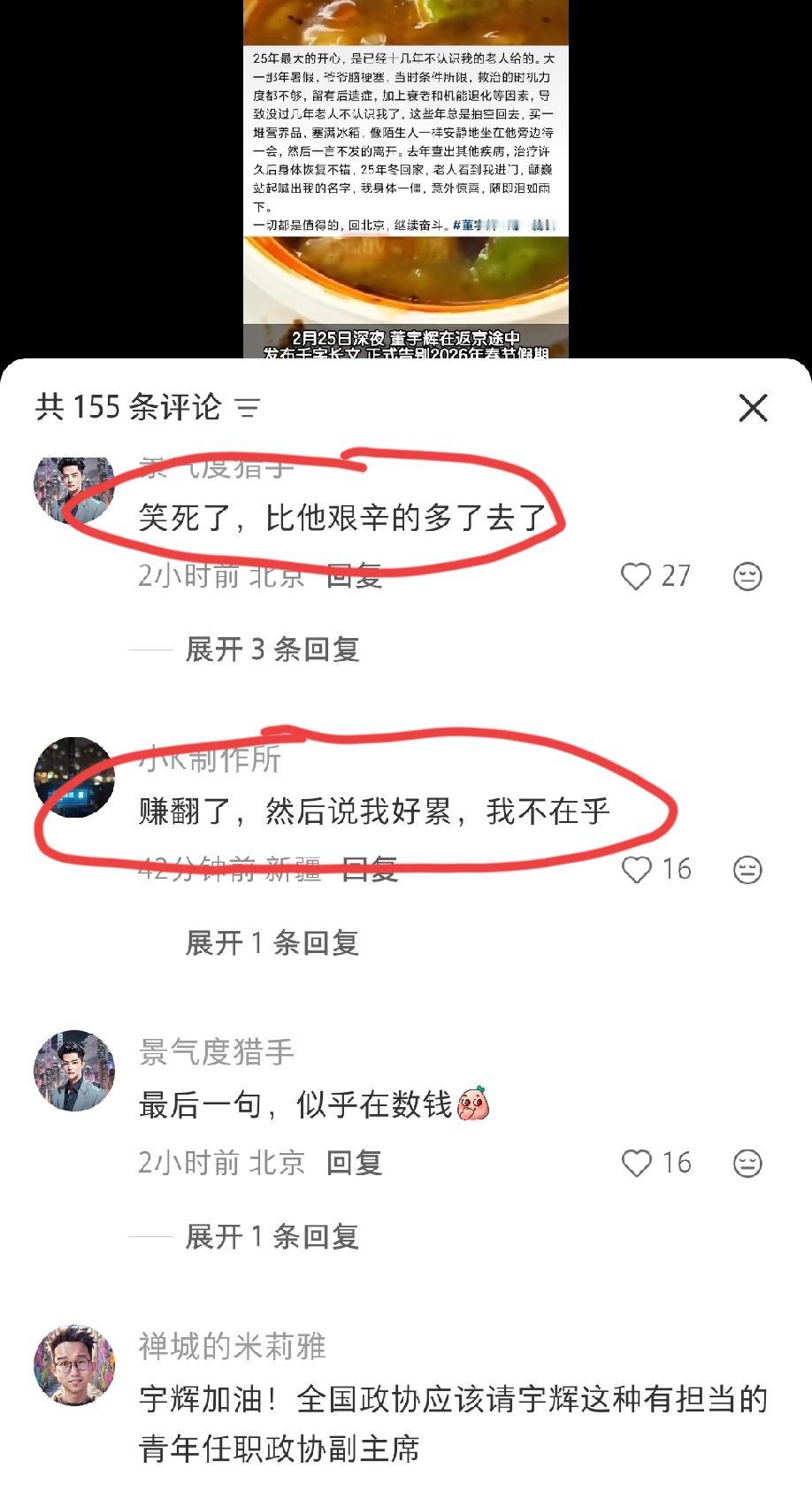 董宇辉千字长文告别“他工作之后的最长一个春节假期”,不得不说,董宇辉的文字功底还是非常了得的,也是非常接地气的,朴素中带着深深的哲理。就比如下面这句:碳水有着很强的实用性……但也有着很强的欺骗性的…… 我们普通人想表达这个意思的时候,只会说“人吃多了,体力是补充了,可就是会犯困”,可他却能整出这么一大段说辞,这也是他在直播间能夸夸其谈几个小时的底气所在。 不过,评论区部分网友还是不喜欢他“无病呻吟”的样子: “笑死了,比他艰辛的多了去了”。 “赚翻了,然后说我好累,我不在乎”。 …… 看了董宇辉的这段文字,你是什么感受?