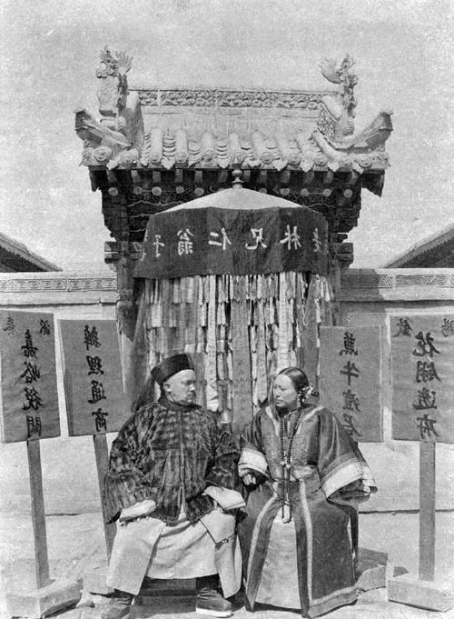 晚清,甘肃肃州(今酒泉)的嘉峪关税关衙门,左侧男子是比利时人林辅臣,他身着清代官服,头戴顶戴花翎,是一位获得清廷三品官衔的“洋官员”。他被李鸿章任命为肃州(嘉峪关)海关的首任税务司,负责管理对俄贸易的海关事务,右侧女子是林辅臣的中国妻子。 他们身后的门楣上悬挂着“于翁仁兄林德”的字样,这是对林辅臣的尊称。两侧的木牌上写着“辦理通商”、“嘉峪稅關”、“花棚遠府”、“魚牛遞運”,清晰地标示了他负管理嘉峪关的通商贸易、税收以及货物(如鱼、牛等)的运输。 1881年《中俄伊犁条约》签订后,清政府允许俄国商人前往肃州(今酒泉)贸易,并在当地设立海关。为了管理这一新的贸易口岸,李鸿章推荐了熟悉中国情况的比利时人林辅臣担任首任税务司。 林辅臣1865年随比利时传教士来华,从一名普通随从成长为精通汉语、熟悉西北情况的“中国通”。他不仅负责海关税务,还在当地行医、办学,深受百姓爱戴,被尊称为“林大人”。