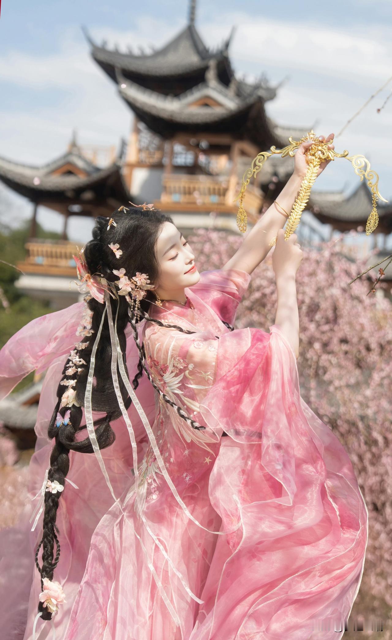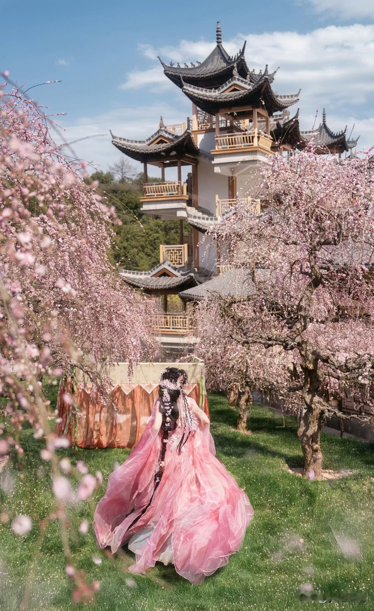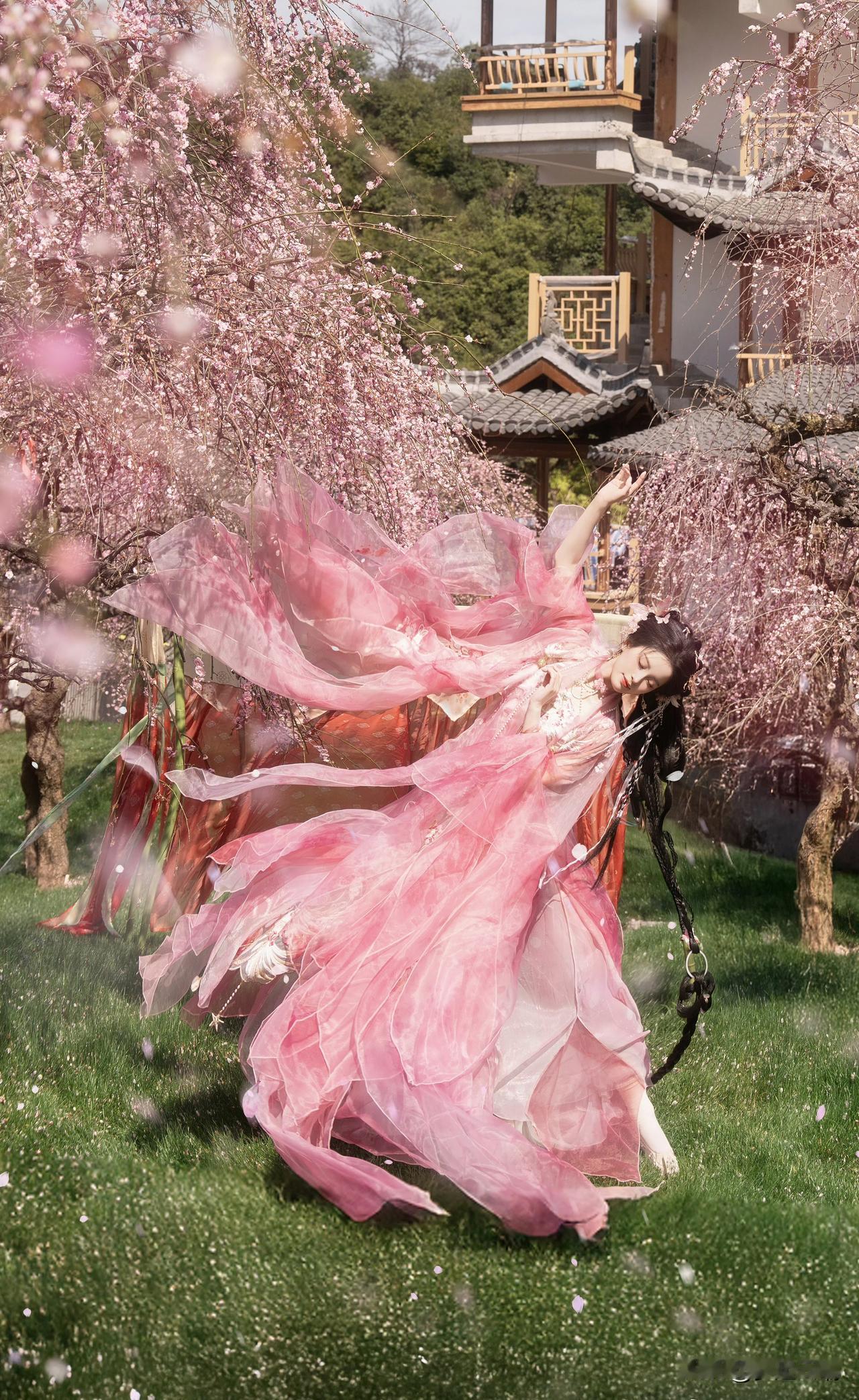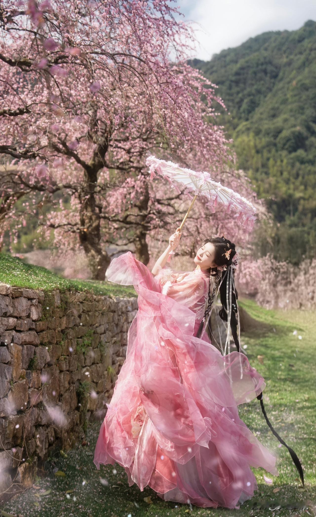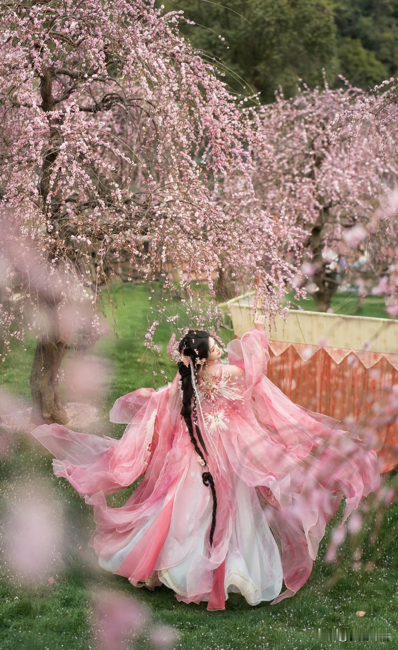 粉衣美人立花间,春意盎然入画来。