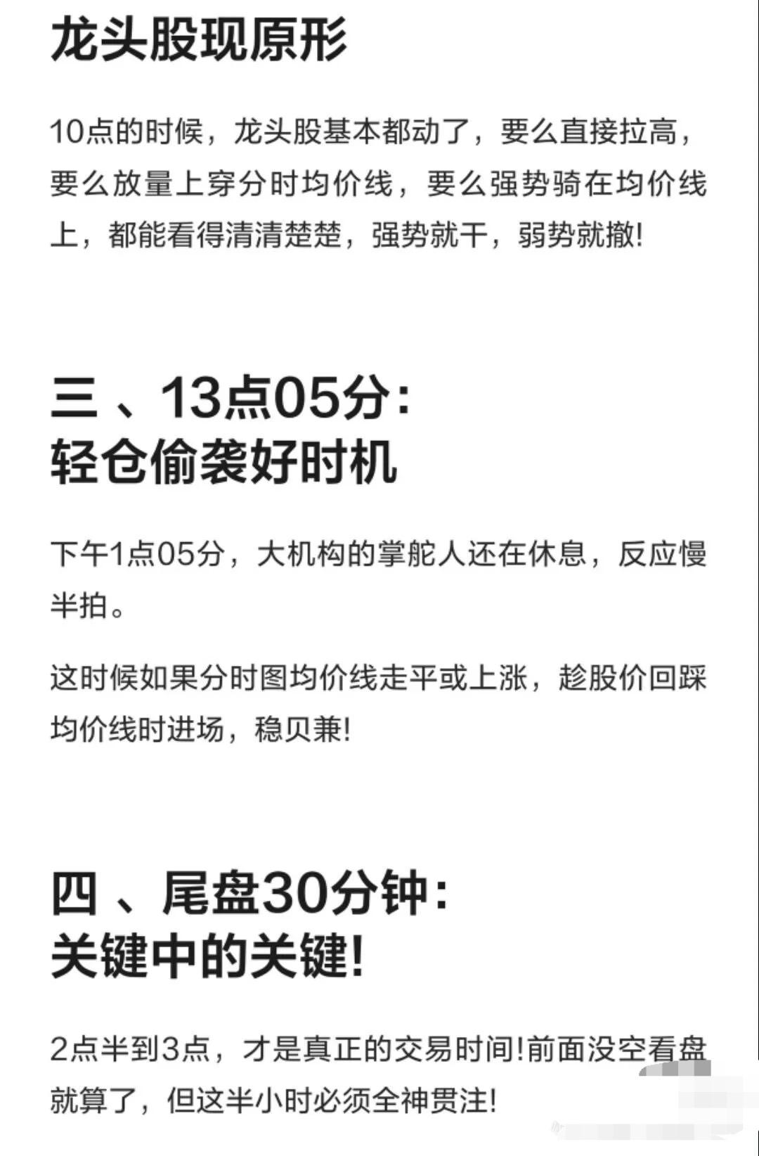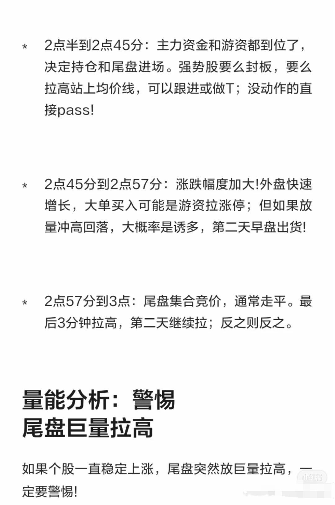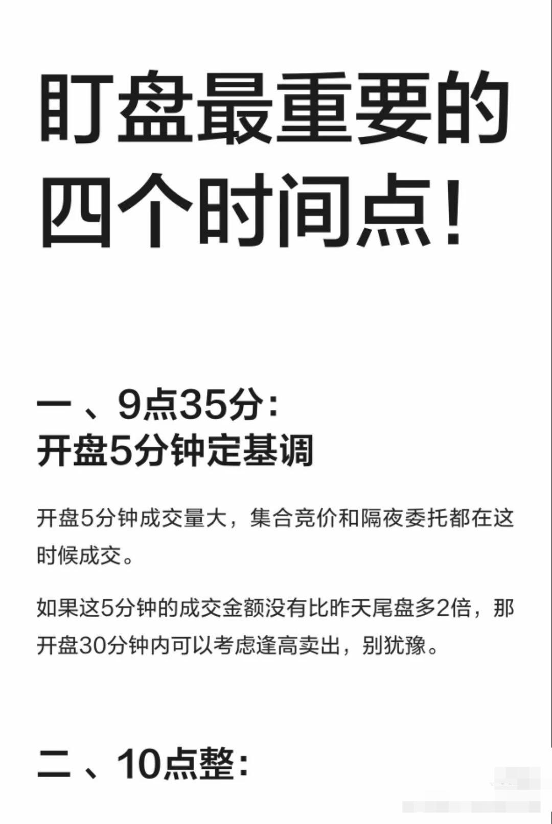 盯盘四个关键时间点及策略: 1. 9:35:开盘5分钟定基调,成交不足昨日尾盘2倍则30分钟内逢高卖。 2. 10:00:看龙头股强弱,强则干弱则撤。 3. 13:05:均价线走平/上涨时,回踩轻仓进。 4. 尾盘30分钟(14:30-15:00): - 14:30-14:45:跟强势股或做T,无动作放弃; - 14:45-14:57:防诱多,放量冲高回落需警惕; - 14:57-15:00:集合竞价看次日趋势。量能提醒:尾盘巨量拉高要谨慎;放量冲高回落次日早盘出局,封板/无滞涨可加仓。