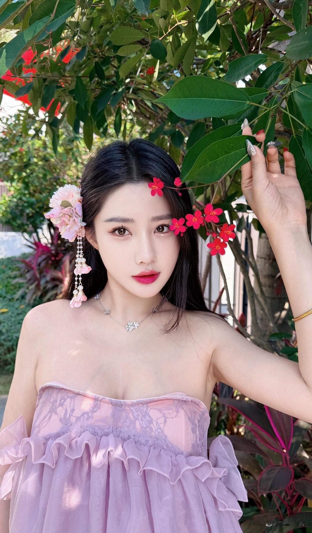 樱花树下,甜美少女,猫耳发饰,黑裙红唇,春日气息。