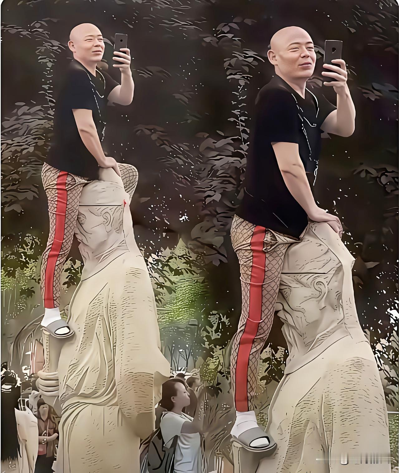 骑在祖宗头上自拍的光头男,脸都不要了吗? 当光头男子把屁股撅在抗倭名将戚继光的雕像头顶,举着手机咧嘴自拍时,他以为自己是在“打卡”,实则是把脸踩进了泥里。这尊承载着四百年民族风骨的雕塑,在他眼里不过是个“网红打卡点”;那些为家国浴血的先辈,在他心中竟不如一张博眼球的照片重要。 更可笑的是,事后他还振振有词:“我是来旅游的,拍个照怎么了?”旅游是看风景、学历史,不是把文明踩在脚下当垫脚石。他骑的不是石头,是民族的脊梁;他践踏的不是雕塑,是国人的底线。当照片曝光后,网友的骂声就是他无耻的结局。 文化不是用来践踏的,公德不是用来践踏的,祖先的尊严更不是用来践踏的。你可以没文化,但不能没底线;你可以不敬畏历史,但不能不要脸。
