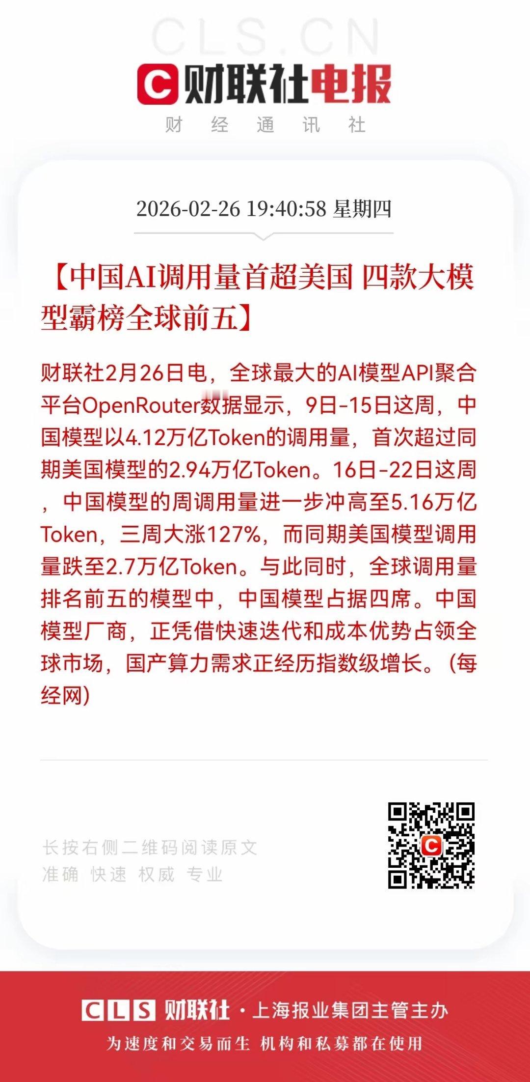 重大利好消息!中国AI调用量反超美国,四款大模型霸榜前五,国产算力需求正经历指数级增长2026年2月,全球AI产业迎来了一个具有里程碑意义的拐点。根据全球最大的AI模型API聚合平台OpenRouter的数据,在2月9日至15日这一周,中国大模型的Token调用量达到了4.12万亿,首次超过了同期美国模型的2.94万亿。仅仅一周后,这一数字更是飙升至5.16万亿,三周内涨幅高达127%,而美国模型的调用量则回落至2.7万亿。这组数据不仅是数字上的超越,更标志着全球AI产业的力量平衡正在发生深刻变化。这波“AI调用量爆发”最受益的是“算力硬件+大模型生态”标的:1. 算力硬件(需求指数级涨) 中科曙光:AI服务器龙头,大模型调用量增长直接带动其服务器出货; 浪潮信息:AI算力硬件供应商,国内大模型的推理、训练都依赖其服务器; 寒武纪:国产AI芯片龙头,大模型的本地化部署需适配其智能芯片。2. 大模型生态(调用量直接变现) 科大讯飞:星火大模型龙头,调用量增长直接带动其To B端AI服务营收; 拓维信息:昇腾服务器代工商,华为大模型的算力需求支撑其订单增长; 润和软件:大模型应用开发商,调用量爆发带动中小客户的AI定制需求。3. 算力配套(支撑硬件运转) 中际旭创:光模块龙头,AI服务器之间的高速通信需依赖其光模块; 新易盛:高速光模块供应商,适配算力集群的高带宽需求;英维克:算力设备散热供应商,AI服务器的高功耗需其冷却方案支撑。以前AI炒的是“模型参数”,这次调用量反超证明“能用、好用才是王道”。对投资者来说,不用盯着“谁的模型参数大”,先看“算力硬件+生态服务商”——毕竟AI越多人用,算力的需求就越凶,这才是实打实的红利。