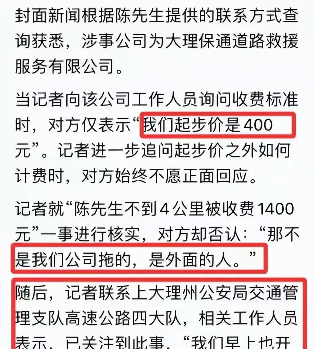这下踢到钢板了! 云南高速上连续出高价的男子,拒绝删除视频。他说自己不是为了退钱,就是想要一个说法! 这位陈先生是广东人,春节期间,带着家人高高兴兴的去大理旅游,没想到走在半路上,轮胎爆了!他自己是做二手车生意的,换个备胎小意思,可千斤顶坏了!真是人在囧途! 他把车子停在应急车道,一筹莫展,村落交警看到了,赶忙帮他联系了拖车。救援拖车来的挺快,工装整齐,设备先进,看着挺正规。陈先生长舒了一口气,可当车子固定好要拖走时,他问了一下价钱,不禁倒吸了一口冷气! 对方开价1500,陈先生查着前面的收费站距离不远,觉得贵了,于是讨价还价 ,最后说定了1400!可走了不到4公里,目的地就到了,拖车司机给了陈先生一个电话,让他交了300的定金,说好了上门服务,但转账一过去,说啥再也联系不上了! 陈先生傻眼了,一家老小还在车上,孩子又冷又饿,哇哇直哭!没办法,就在网上疯狂联系愿意上门补胎的,终于找到一家,结果收费1780,没办法,只能接受。晚上9点多,车胎终于换好了,一家人赶紧找地方吃了点饭,旅游好心情荡然无存! 救援公司联系到陈先生,让他删帖,给他退费,被拒绝后,恼羞成怒,语带威胁。 监管部门应当积极作为, 查清责任,严惩违规,将漫天要价回归合理,让广大车主即使人在囧途,业不会寒了心![祈祷][祈祷][祈祷] 先生越想越气,自己爆了个胎,前前后后花了3480,自己就是待宰的羔羊吗?于是将事情发到了网上!