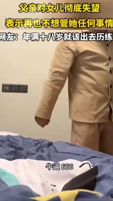 “养个白眼狼?”一父亲指着女儿说:今后我不再给你出1分钱,以后你的任何事情我一概不管,你爱怎样就怎样。女儿讥笑道:这就是你的免责声明,好有意思啊,你们中国大男子汉,你就是不想给钱!父亲气的火冒三丈质问:电脑、平板是不是我买的?女儿一句话直接给父亲气个倒仰,网友:女儿养成这个样,确实让父母恼火。 父亲李先生(化名)和女儿小静(化名)因为钱和生活安排的矛盾,直接闹到了社交平台上,引发网友热议。 小静今年刚刚大学毕业,性格独立又有些叛逆。平时父女关系还算融洽,但最近因为工作和生活开销的问题,家里的矛盾逐渐升级。 一天,李先生忍不住了,他坐在沙发上,指着女儿严肃地说:“小静,今后我不再给你出一分钱,以后你的任何事情我一概不管,你爱怎样就怎样!”语气里带着压抑已久的怒火和无奈。 小静听了这话,先是愣了愣,然后慢慢地从床上坐起,盖着的被子还半遮着身体,一边拿出手机开始录视频。 她嘴角勾起一抹讥笑,像是在做一件非常有趣的事情:“这就是你的免责声明啊,好有意思啊!你们中国大男子汉,就是不想给钱!” 她的语气里带着调侃,又有一丝挑衅,像是在和父亲玩心理战。 李先生火冒三丈,他从来没想过女儿会这样反应,他立刻质问:“电脑、平板是不是我买的?!”声音里带着责备和几分绝望。 李先生心里其实很清楚,这些年他为了女儿的学习和生活已经花费不少,但女儿似乎根本不领情,反而拿手机把这一切记录下来,仿佛在向外界展示他“吝啬”的一面。 小静却轻描淡写地回答,语气里带着故意的轻松:“也就是说,说也不敢承认,不让人说啊,牛×666。” 她的话就像一根火柴点燃了李先生的怒火,他的脸刷地一下红了,差点气得坐不住。 女儿的这一句调侃,完全击中了他的痛处——这些年来,他无论多忙、多累,都是为了女儿好,而现在却被质疑成“小气、控制欲强”。 小静录完视频后,直接上传到社交平台,并配上文字:“大男子汉的免责声明,好有意思啊。”瞬间就吸引了大量网友围观和评论。 有人点赞,有人留言,有人直接开了话题:“父母与成年子女的经济独立”。 很快,评论区炸了,弹幕像潮水一样涌入,网友们的观点五花八门,但不难看出,愤怒和不理解占了大多数。 有人直接开口就批评:“这女儿太不懂事了吧?父母一生辛苦供你读书,现在一毕业就这样挑衅父母,你也不想想父母辛苦不辛苦。” 底下立刻又跟着一堆点赞和附和的留言:“对啊,你爸妈拼了命把你养大,现在你这是啥意思!”、“录视频发网上?这就是典型不懂感恩的行为!” 还有人说得更直白:“看到这种视频我就火,别说什么独立了,这叫没家教。成年了就得学会尊重父母,知道父母辛苦才行。” 评论里有人贴上自己父母的照片,写着“你爸妈为了你起早贪黑,我还没录视频去网暴他们呢”,仿佛在用个人经历强化观点。 更有网友发挥自己的想象力:“这孩子估计平时在家里作天作地,父母可能已经忍够了,现在一气之下说不管,你就录视频炫耀?这不是把家务事变成网红事件吗!” 还有人调侃:“成年人要经济独立是应该,但这姿态太嚣张了,你爸辛苦多年,这算啥独立精神啊,简直是公然挑衅。” 整个评论区几乎被一股‘父母辛苦,孩子不懂事’的情绪淹没,很多人都在叠加自己的经历来表达愤怒和无奈,有的甚至呼吁:“希望这孩子能醒醒,别把家庭矛盾搬到网上,这太不尊重父母了。” 也有人站在女儿角度:“成年人的生活,应该自己负责,你爸说不管就不管,女儿记录下来让大家看看,这也没错吧?成年人之间的经济独立,是必须的。” 还有人评论得更犀利:“这就是典型的家庭教育失衡,父母一边溺爱,一边又要求绝对控制。现在孩子学会了用网络发声,父母还气得半死。” 网友的讨论越来越热烈,甚至有人贴出了类似经历:“我家也差不多,我爸妈总是说不管了,我也开始录视频发朋友圈了,这种感觉真的很解气。”