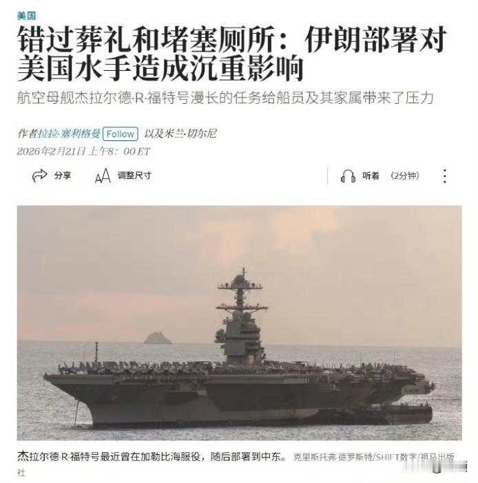 福特号离港克里特岛,网友:拉完就跑… 彭博社:美国海军“福特”号航空母舰,昨天启程离开希腊克里特岛,前往东地中海,准备拦截伊朗发射的导弹。但是一个不妙的消息是全员士气低落。自2025年6月从诺福克母港出发,到现在2026年2月,已经在海上漂了整整8个多月。这还没完,如果伊朗局势恶化,这艘航母的部署时间很可能要拉到10个月甚至11个月,直接打破越战以来美军航母连续部署的最长纪录。 一个细节是,造价130亿美元的美国最强航母,全舰近9成厕所瘫痪,4600水兵靠希腊移动厕所救急。 如今任务继续,奔赴东地中海。 网友:克里特岛的海没事,福特号是真有味道。