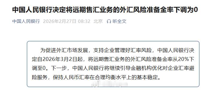 为促进外汇市场发展,支持企业管理好汇率风险,中国人民银行决定自2026年3月2日起,将远期售汇业务的外汇风险准备金率从20%下调至0。下一步,中国人民银行将继续引导金融机构优化对企业汇率避险服务,保持人民币汇率在合理均衡水平上的基本稳定。