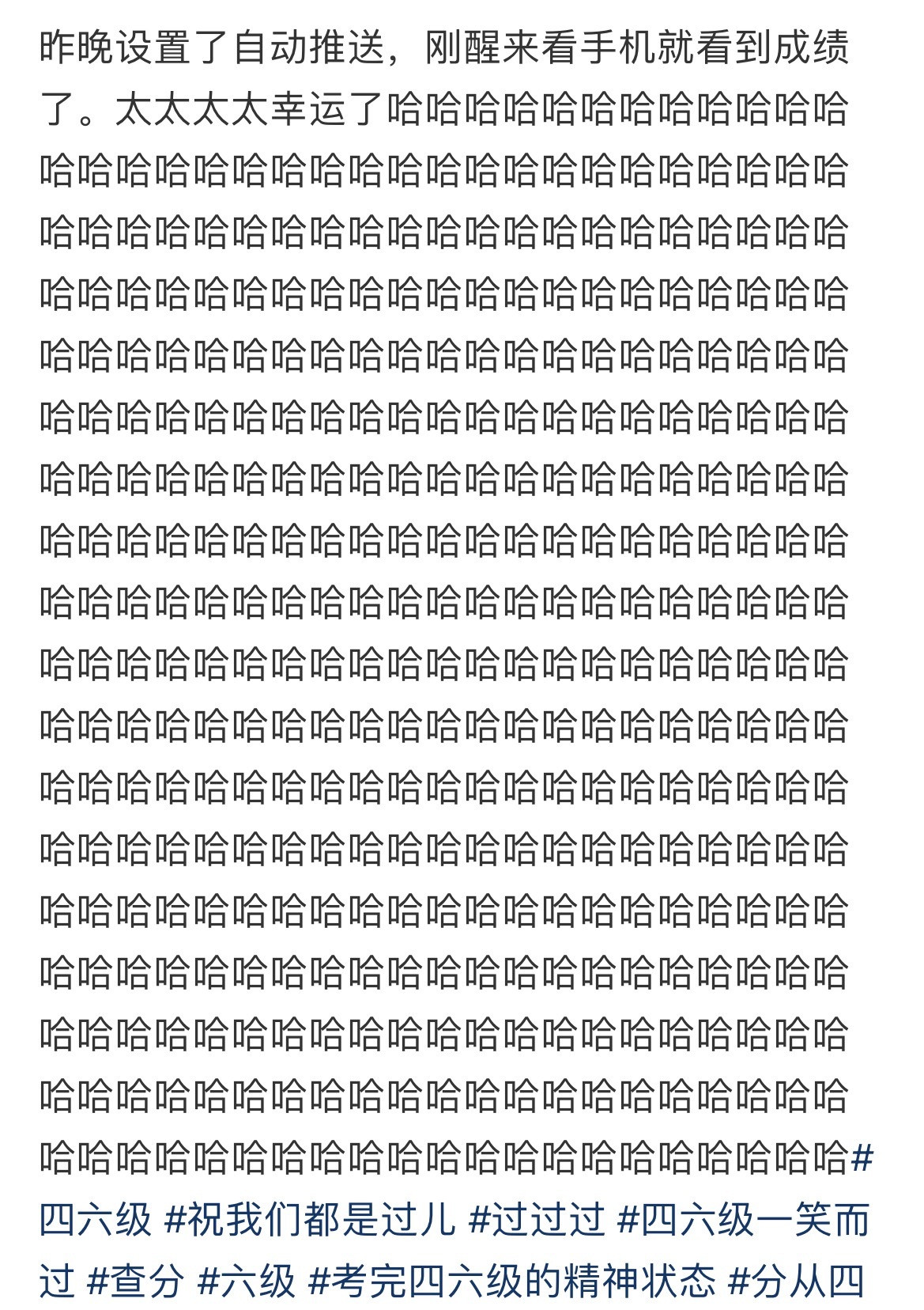 四六级查分看到个网友查分是426,什么含金量?还是第一次见人打这么多个哈哈哈,估计要笑一天了