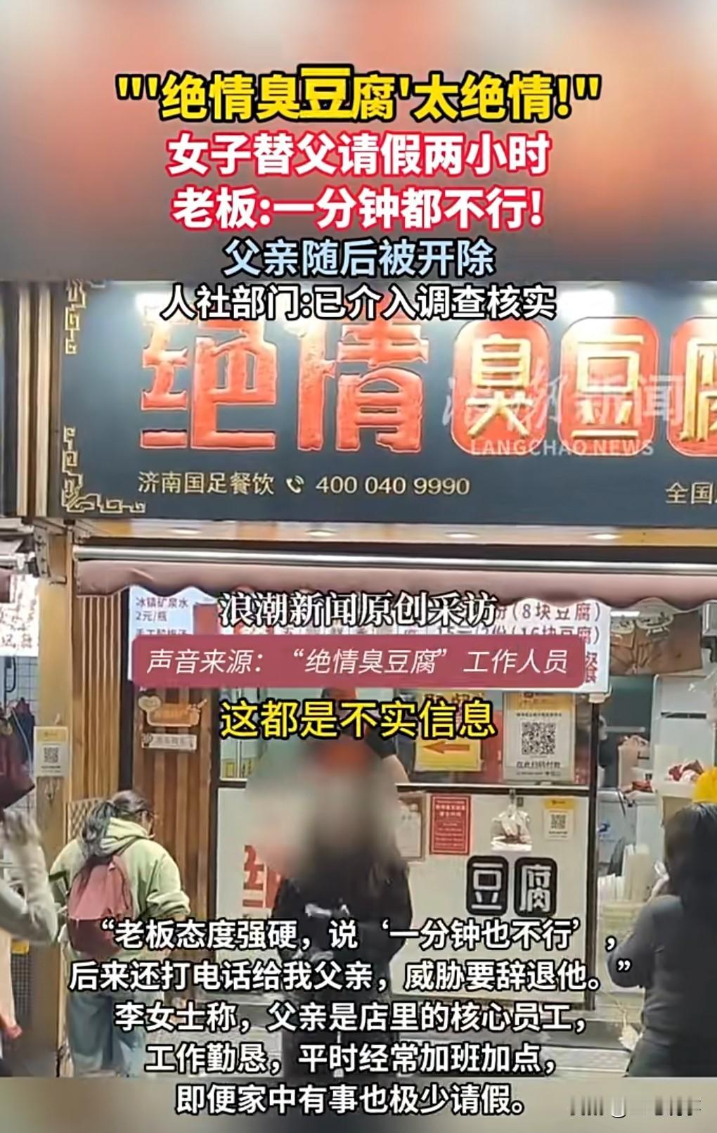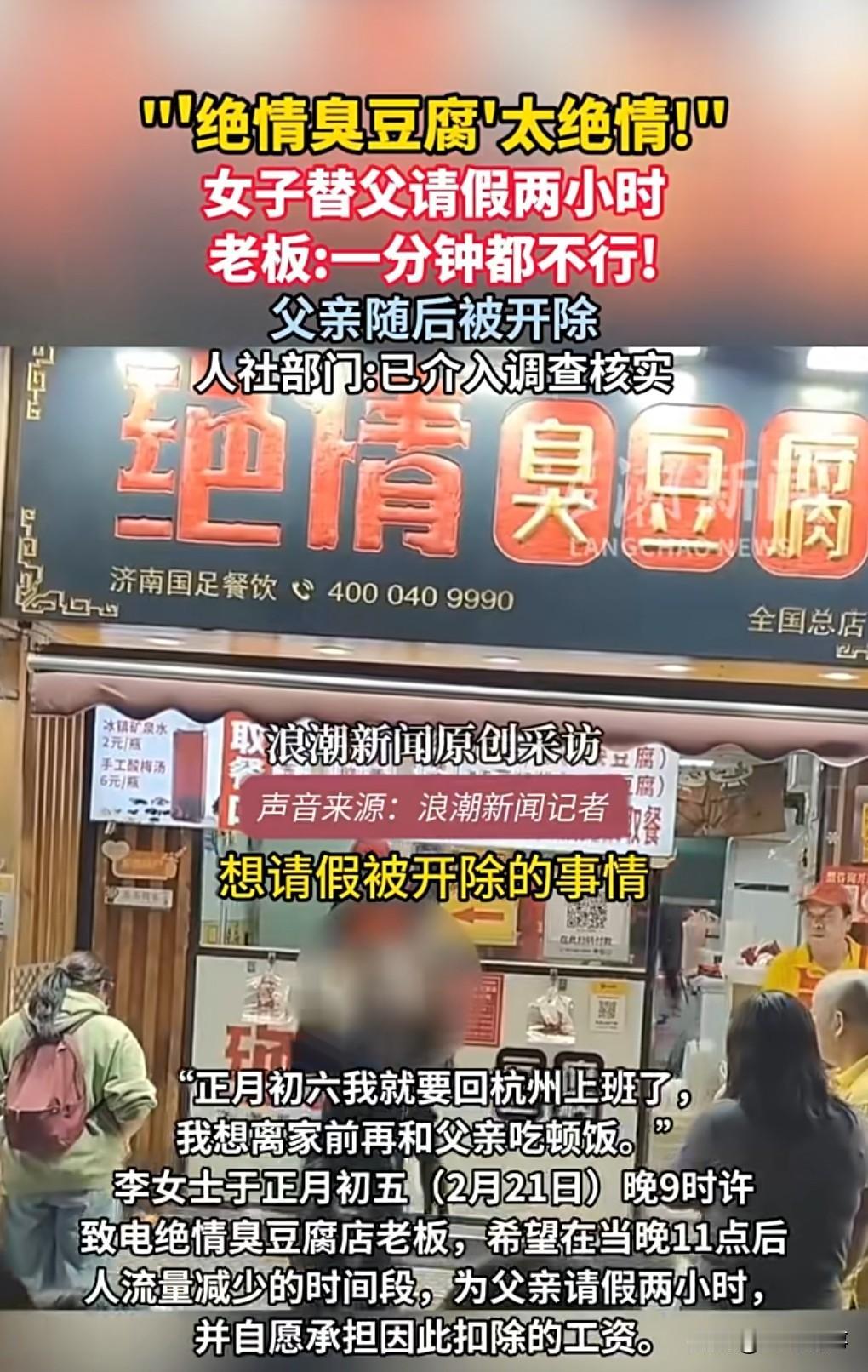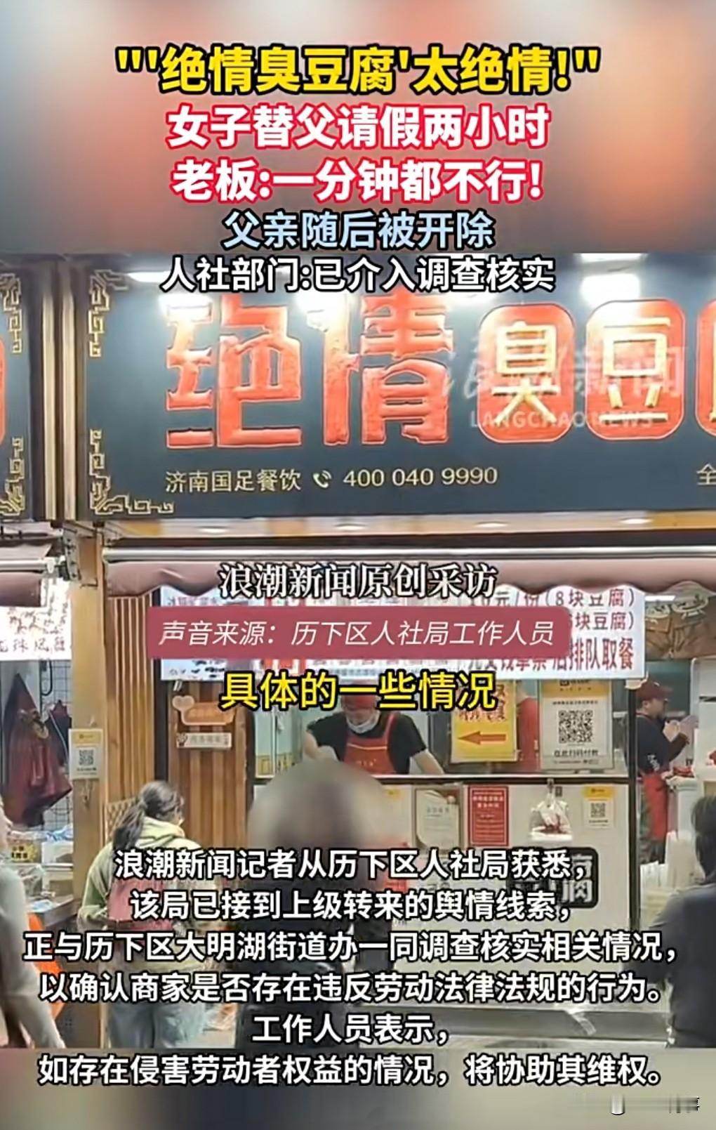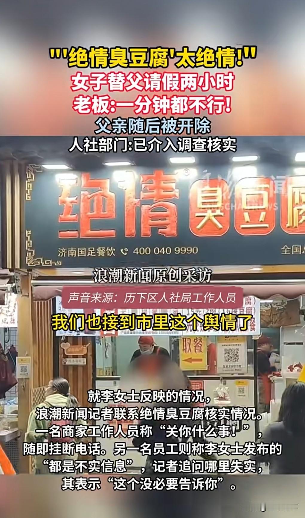 真是人如其名,果然够绝情啊。 近日,济南一家“绝情臭豆腐”店因员工女儿替父请假两小时被拒绝,父亲随后被开除,引发关注,老板说请假一分钟都不行。 当地人社部门已介入调查核实。 果然够绝情了,不愧是绝情臭豆腐店。 有记者打电话询问那里面的员工,员工态度也不好,情商也不高,说关你们什么事。 希望这样不正规的店越少越好。 为了生存,很多人都是在那种不正规的店里打工的。 社保也没有。 这名女主的父亲是里面的炸锅师傅,经常忙到零点,想不到干这么晚,太辛苦了,太不值了。 而且也是个老实人,经常加班加点。 春节期间只休息了一天,餐饮业就是这么样,不知道有没有给三倍工资,估计也没有。 想不到就因为这事,老板既然要开除炸锅师傅,绝情的很啊。 一定不能让这样的店做大做强,太坑人了。