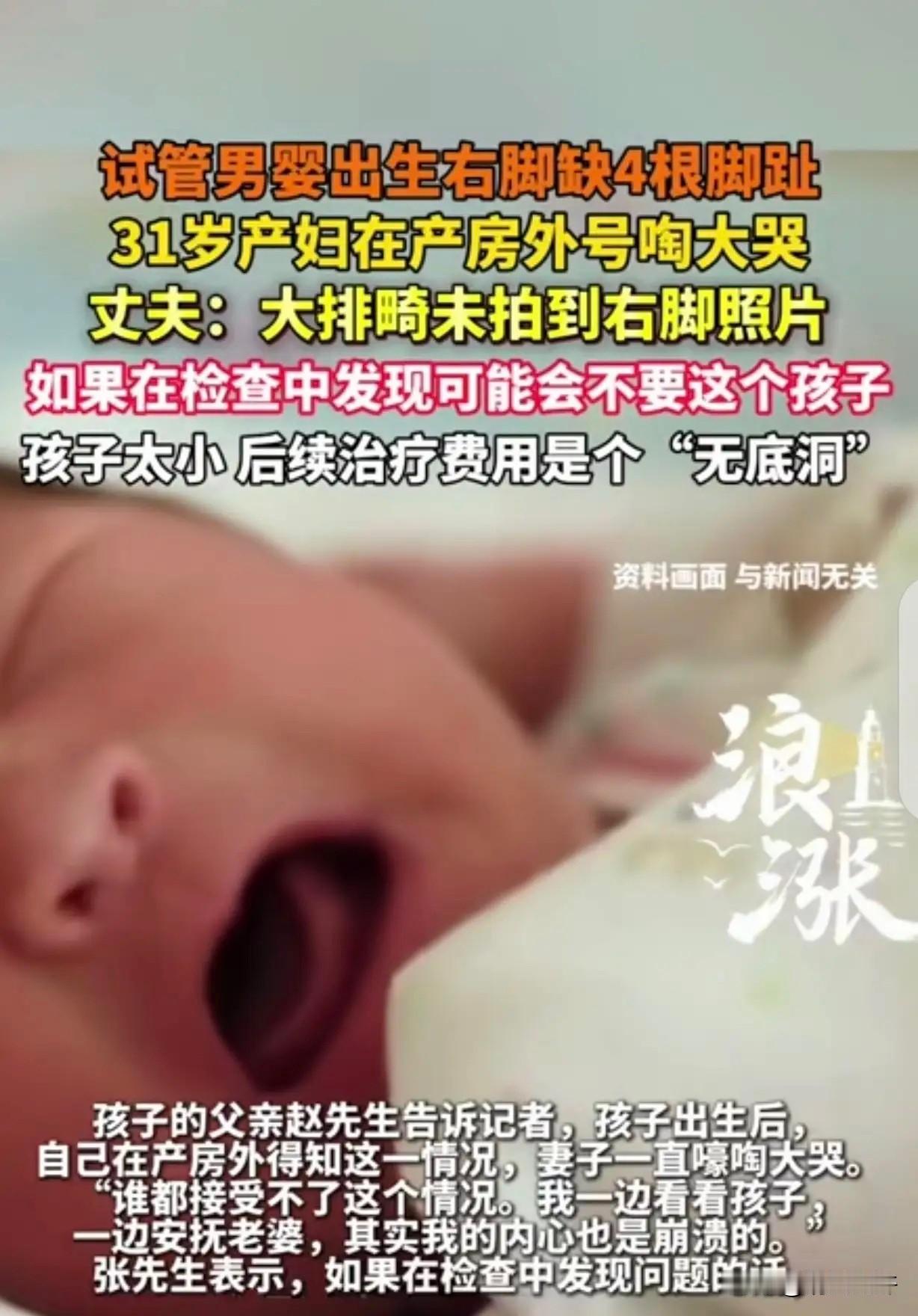 “崩溃了!”一31岁女子输卵管有问题,无法自然受孕,她和35岁丈夫去做了试管,成功怀孕后,女子做了10次产检,怀孕5个月时,又做了四维大排畸检查,胎儿一切正常,可她大年初四生下孩子,竟然发现他右脚缺4根脚趾,女子崩溃大哭。丈夫怒了:如果检查时发现,我们不会要这个孩子,后续治疗费是无底洞。 31岁的张女士和35岁的赵先生结婚4年了,一直没要上孩子。 他们不是没试过。张女士的输卵管堵塞,是婚前体检就查出的问题。那时候两人刚领完证,看着体检报告上的字,赵先生攥着她的手说“没事,大不了我们丁克”,可张女士知道,他心里藏着对孩子的渴望。 逢年过节走亲戚,赵先生总会蹲在堂哥家的小侄子身边,捏捏孩子的脸蛋,眼神里的羡慕藏不住。为了圆这个梦,他们跑遍了市里的三甲医院,中药喝了一麻袋,针灸扎得腿上都是淤青,每次促排卵针打在肚皮上,张女士都咬着牙不吭声,赵先生在旁边攥着毛巾,手心全是汗。 取卵那天,张女士疼得直冒冷汗,赵先生握着她的手,眼泪砸在她的手背上,说“等我们有了孩子,再也不让你受这份罪”。 终于在2024年的秋天,试管胚胎成功着床。拿到B超单的那天,张女士在医院走廊里哭了,赵先生抱着她,声音都在抖:“我们有孩子了。” 从那天起,张女士成了医院的常客。建档、NT、唐筛、糖耐……每一次产检都像闯关,她攥着赵先生的手,盯着B超屏幕上那个小小的轮廓,生怕错过任何一个细节。 怀孕五个月的四维大排畸,是他们最期待的检查。那天张女士特意穿了件红色外套,想讨个好彩头,进检查室前,赵先生还塞给她一块巧克力,说“孩子说不定会给我们比个心”。 检查室里,B超探头在肚子上滑动,医生的声音很平稳:“双顶径正常,股骨长正常,心脏结构没问题……” 张女士盯着屏幕上的小手小脚,眼泪又下来了。医生还特意把屏幕转过来,让她看孩子攥着小拳头的样子,说“看,这是小手,这是小脚,都挺健康的”。赵先生在外面等,看到张女士笑着出来,悬着的心彻底放下。 检查报告上“胎儿结构未见明显异常”的字样,被他们用红笔圈了又圈,贴在冰箱上,每天都要看好几遍。张女士还把四维照片设成了手机壁纸,每次解锁手机,都能看到孩子皱着眉头的小脸,心里软得一塌糊涂。 整个孕期,张女士严格按照医嘱补充营养,不敢吃辣,不敢熬夜,连走路都慢了半拍。赵先生推掉了所有不必要的应酬,每天下班就回家给她煲汤,晚上陪着她散步。他们给孩子取了小名叫“安安”,希望他平平安安。 大年初四的凌晨,张女士破水了,赵先生裹着外套就往医院跑,产房外的走廊里,他坐立不安,手里攥着的产检报告被揉得发皱。护士出来好几次,都说“宫口开得慢,再等等”,他每等一分钟,都像过了一个世纪。 “是个男孩,六斤八两。”护士抱着孩子出来的时候,赵先生冲上去,可当他看到孩子的右脚,整个人僵在原地。 那只小脚上,只有孤零零的大脚趾,另外四根脚趾,彻底缺失。张女士还在产房里观察,等她被推出来,看到孩子的那一刻,直接晕了过去。 醒来的时候,她躺在病床上,抱着孩子,眼泪砸在孩子的小脸上,怎么擦都擦不完。赵先生坐在旁边,烟一根接一根地抽,病房里的空气都凝固了。他不敢看张女士的眼睛,更不敢看孩子的脚,心里像被掏空了一样。 他们找医院要说法,院方的回应让他们心寒。负责四维检查的医生说,当时胎儿的体位不好,右脚被脐带挡住了,所以没拍到完整的影像。“我们已经按照规范操作了,这种情况属于漏诊,不是我们的责任。” 赵先生把那张被揉皱的四维报告拍在桌子上,声音嘶哑:“你们说没拍到?那报告上写的‘胎儿结构未见明显异常’是怎么回事?我们信了你们的话,才把孩子生下来,现在这个结果,谁来负责?”院方的领导避而不见,只让医务科的工作人员出来应付,说“可以走法律程序,我们配合调查”。 医院的态度很消极,只愿意出于人道主义补偿几千块钱。 赵先生去咨询了律师,律师说,这种医疗纠纷很难界定责任,想要获得足额赔偿,需要漫长的鉴定和诉讼,光是医疗过错鉴定,就要等大半年。可他们等不起。孩子的满月酒没办,亲戚朋友问起来,他们只能含糊其辞。 张女士不敢带孩子出门,怕别人投来异样的眼光,每天把自己关在房间里,抱着孩子发呆。赵先生则四处打听治疗方案,得到的答案都一样:孩子太小,现在不适合手术,等长大一点再做矫形,后续的康复治疗、义肢费用,是个无底洞。 他们的积蓄很快就花光了。赵先生把家里的车卖了,又向亲戚借了钱,可面对动辄几十万的治疗费用,还是杯水车薪。 现在,孩子已经半岁了,会笑了,会抓东西了。张女士每天给孩子的右脚做按摩,希望能促进发育。赵先生找了两份工作,白天在工地搬砖,晚上去夜市摆摊卖小吃,累得倒头就睡,可只要看到孩子的笑脸,就觉得一切都值得。 各位读者你们怎么看?欢迎在评论区讨论。